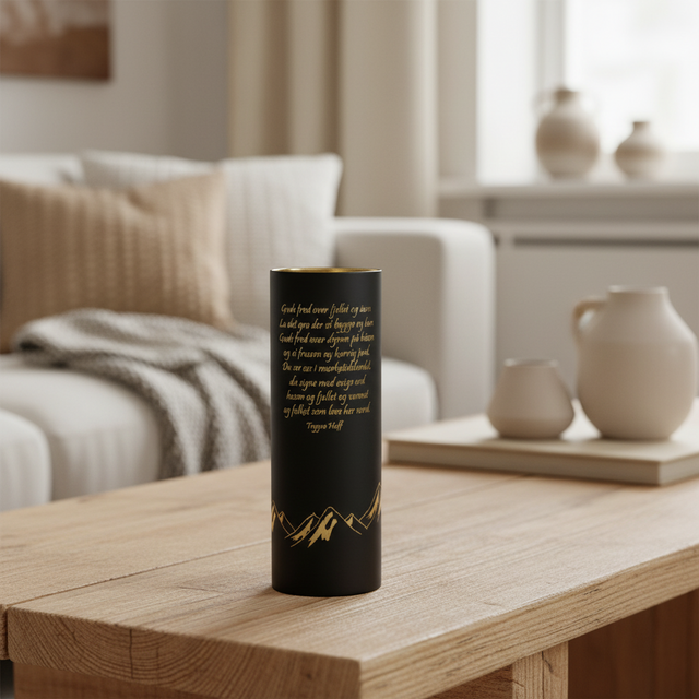 En høy og dekorativ lyslykt i matt sort med innebygd LED-lys som gir et varmt og behagelig skinn. Teksten fra Trygve Hoff og fjellmotivet i gull gjør den til en fin detalj i både moderne og tradisjonelle hjem.