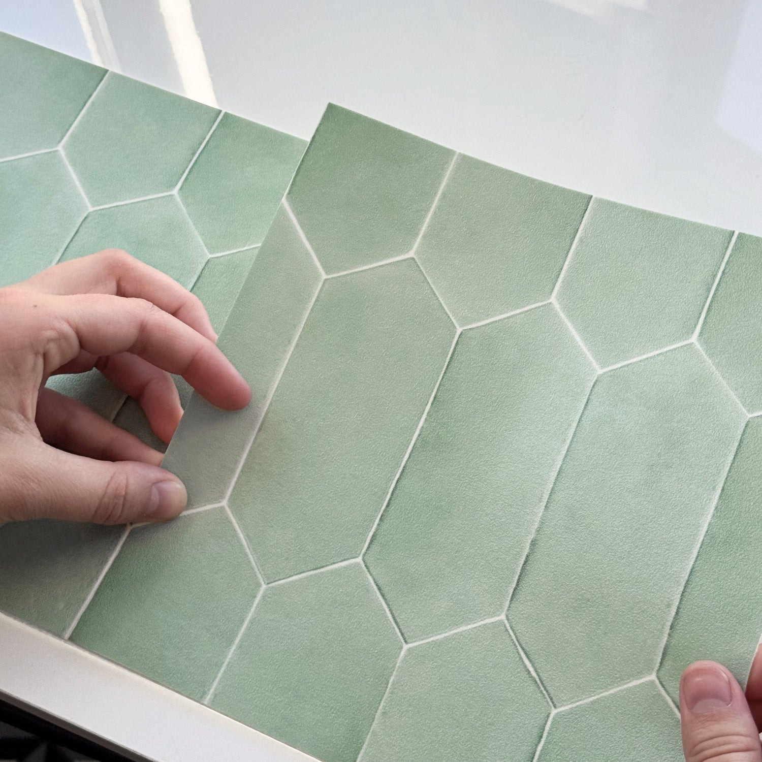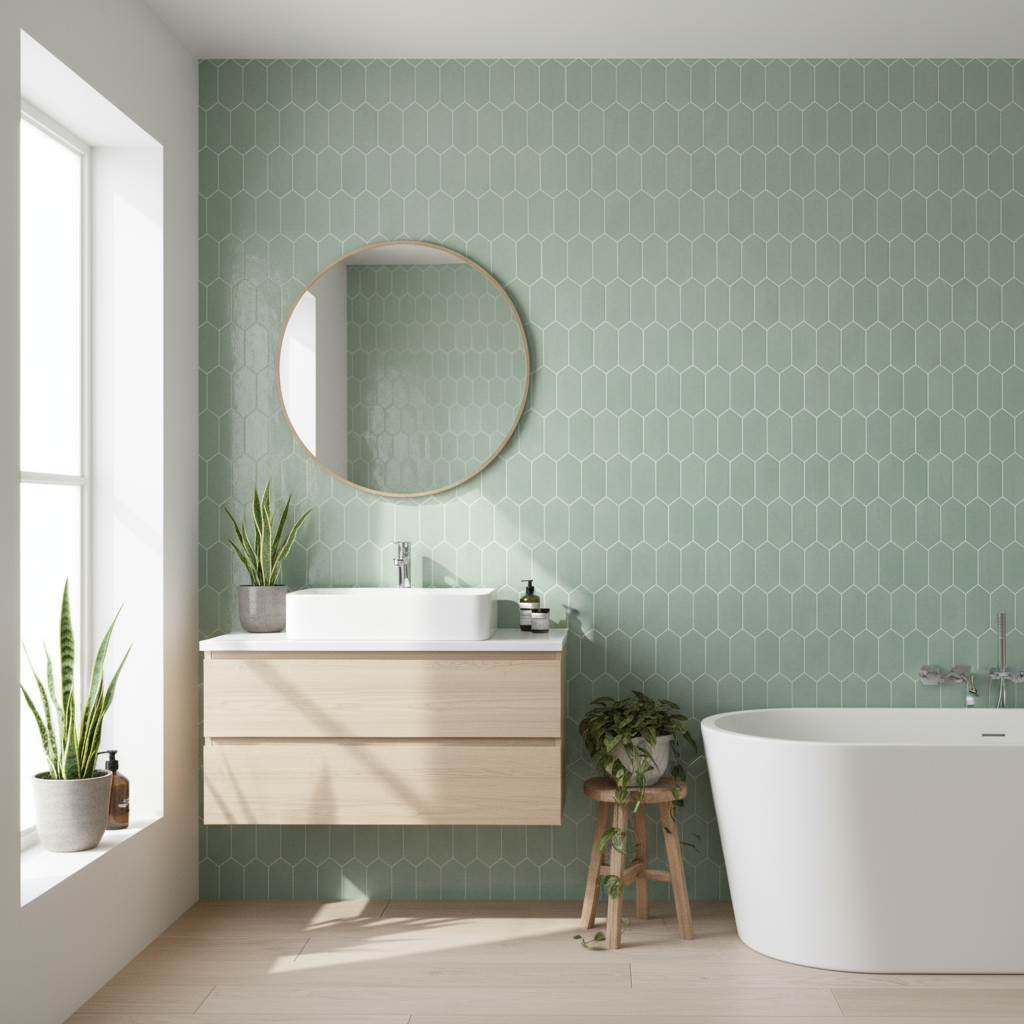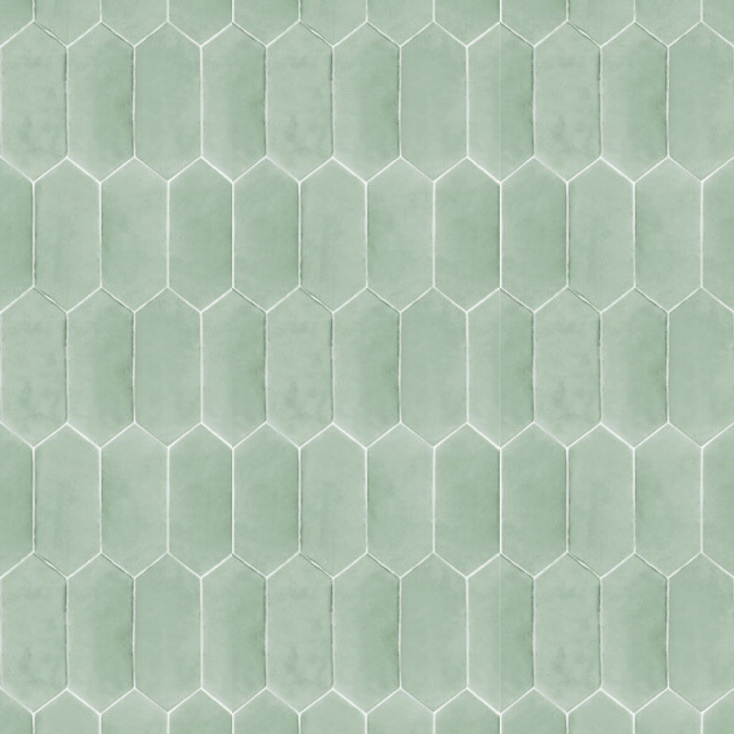 Mønsteret består av avlange sekskantede fliser som skaper et levende og håndlaget uttrykk på veggen. Den kalde undertonen i grønnfargen gjør flisene enkle å kombinere med både nøytrale farger og naturmaterialer.