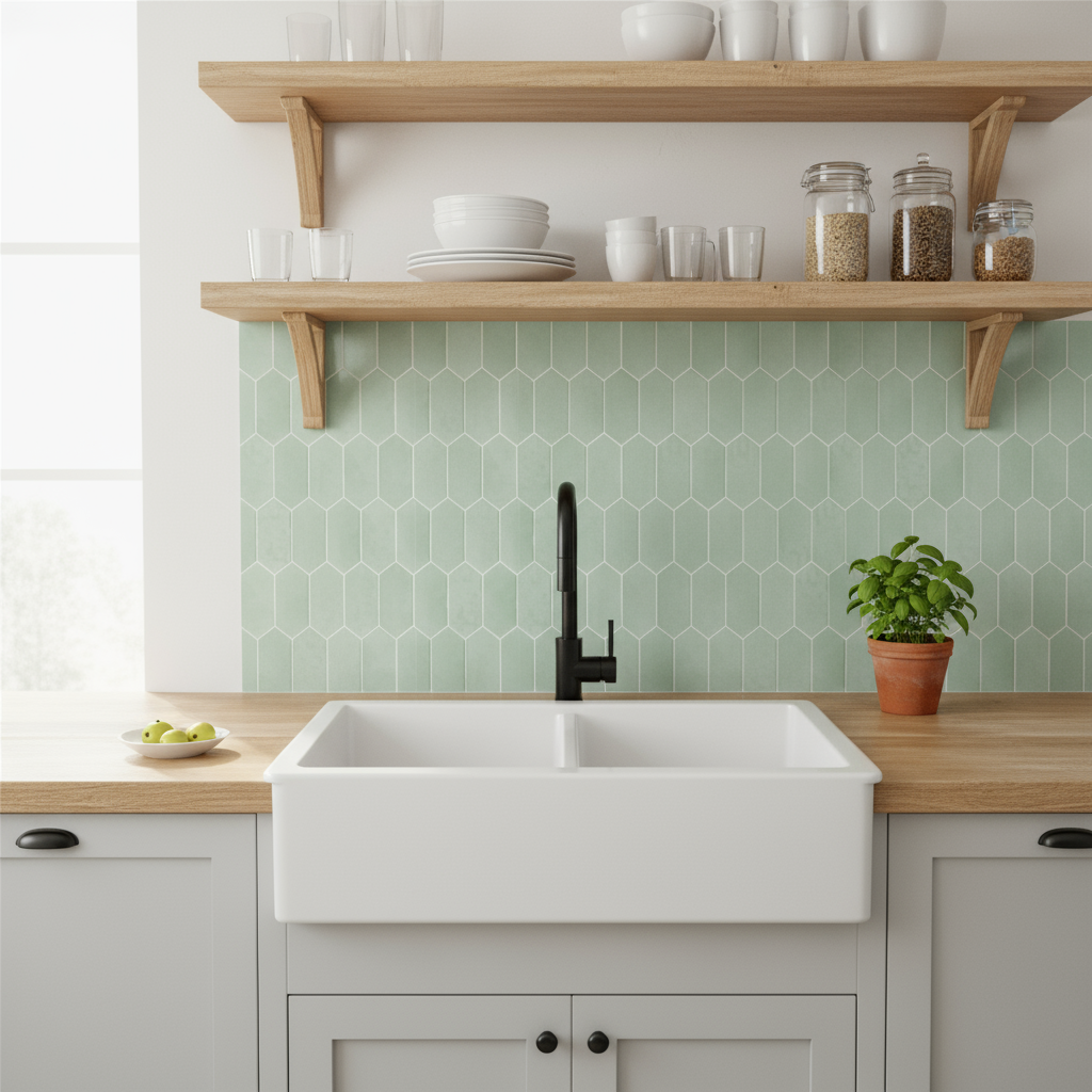 Mathilde lys grønn selvklebende fliser gir veggen et friskt og rolig uttrykk inspirert av klassiske zellige-fliser. Den mellomlyse grønnfargen kombinert med hvite fuger gir et naturlig preg som passer godt sammen med både lyse kjøkken, treverk og nordiske interiører.