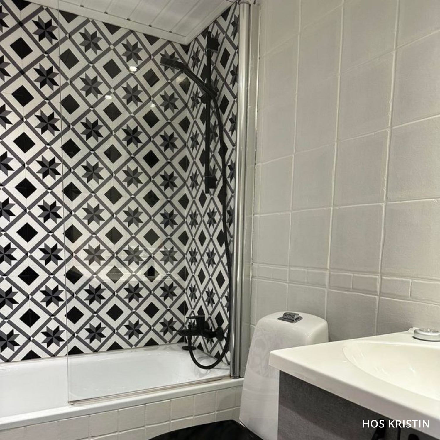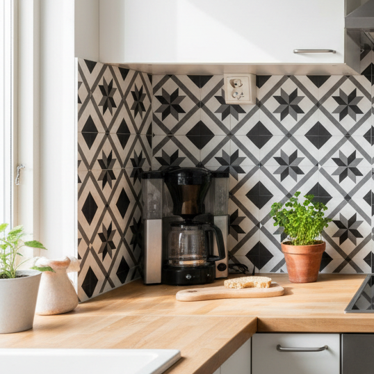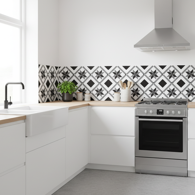 Gi rommet et stilrent løft med Oslo selvklebende fliser. Det grafiske sort-hvite mønsteret er inspirert av klassiske sementfliser og gir et dekorativt uttrykk som passer godt i både moderne og tradisjonelle hjem.