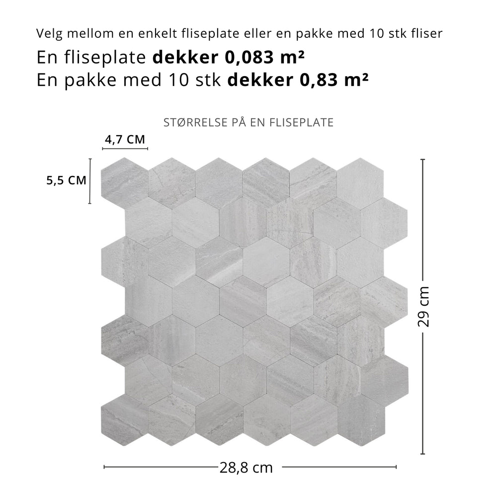 Selvklebende sekskantfliser i lys grå steinlook – moderne veggfliser som passer perfekt på kjøkken eller bad for et stilrent og tidløst uttrykk.