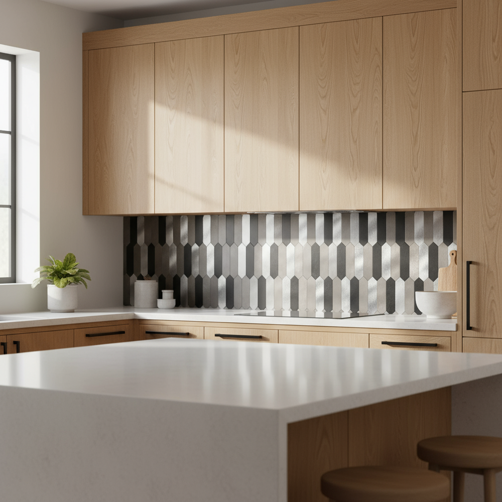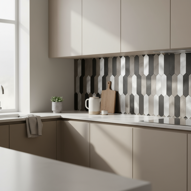 Tanya selvklebende fliser kombinerer kontrastfulle nyanser av svart, grått og sølv i et moderne avlangt hexagonmønster.