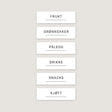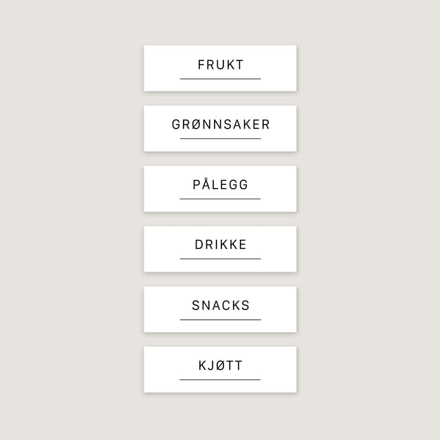 Denne pakken inneholder etiketter til: Frukt, Grønnsaker, Pålegg, Drikke, Snacks, Kjøtt