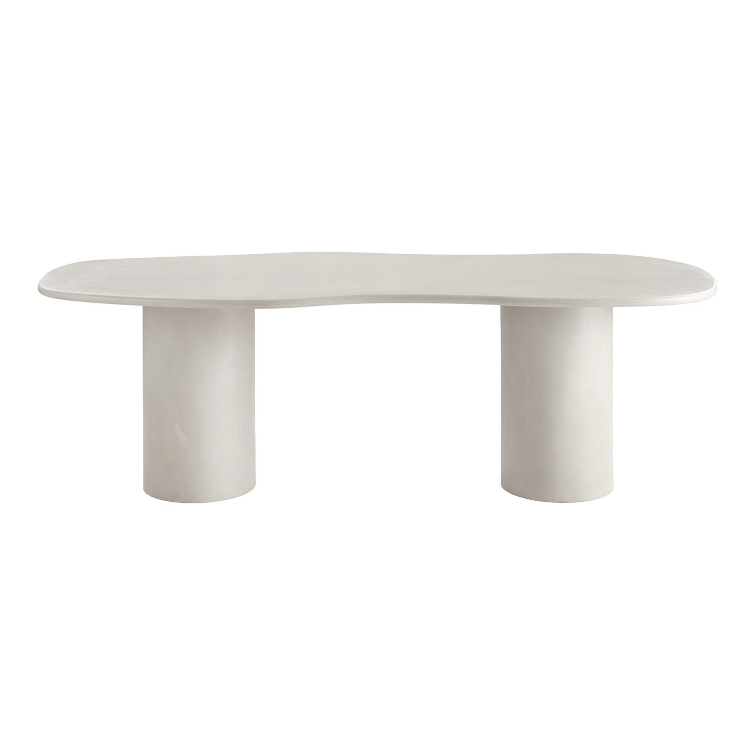 De to massive søylebena bidrar til økt stabilitet og skaper et skulpturelt uttrykk som løfter rommet visuelt. Den beige sementfinishen gir bordet et mykt, men samtidig kraftfullt preg som passer inn i mange ulike hjemmestiler fra nordisk minimalisme til mer urbane interiører.