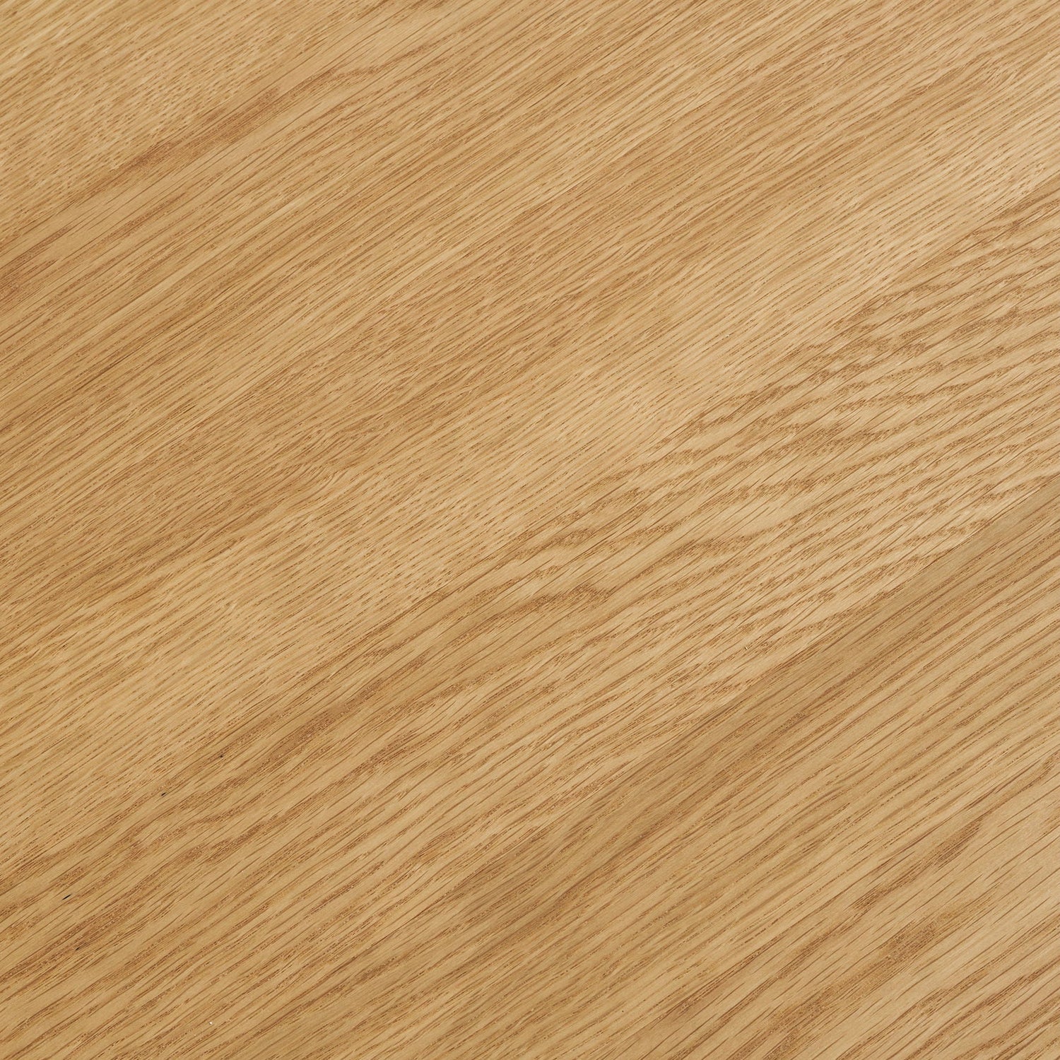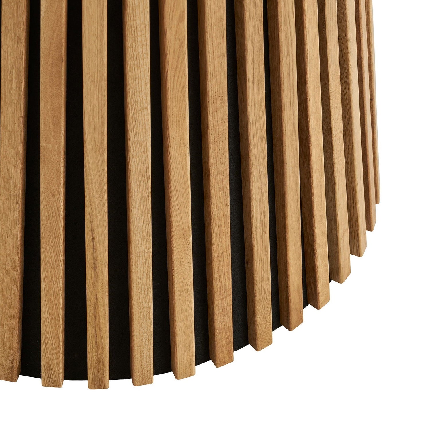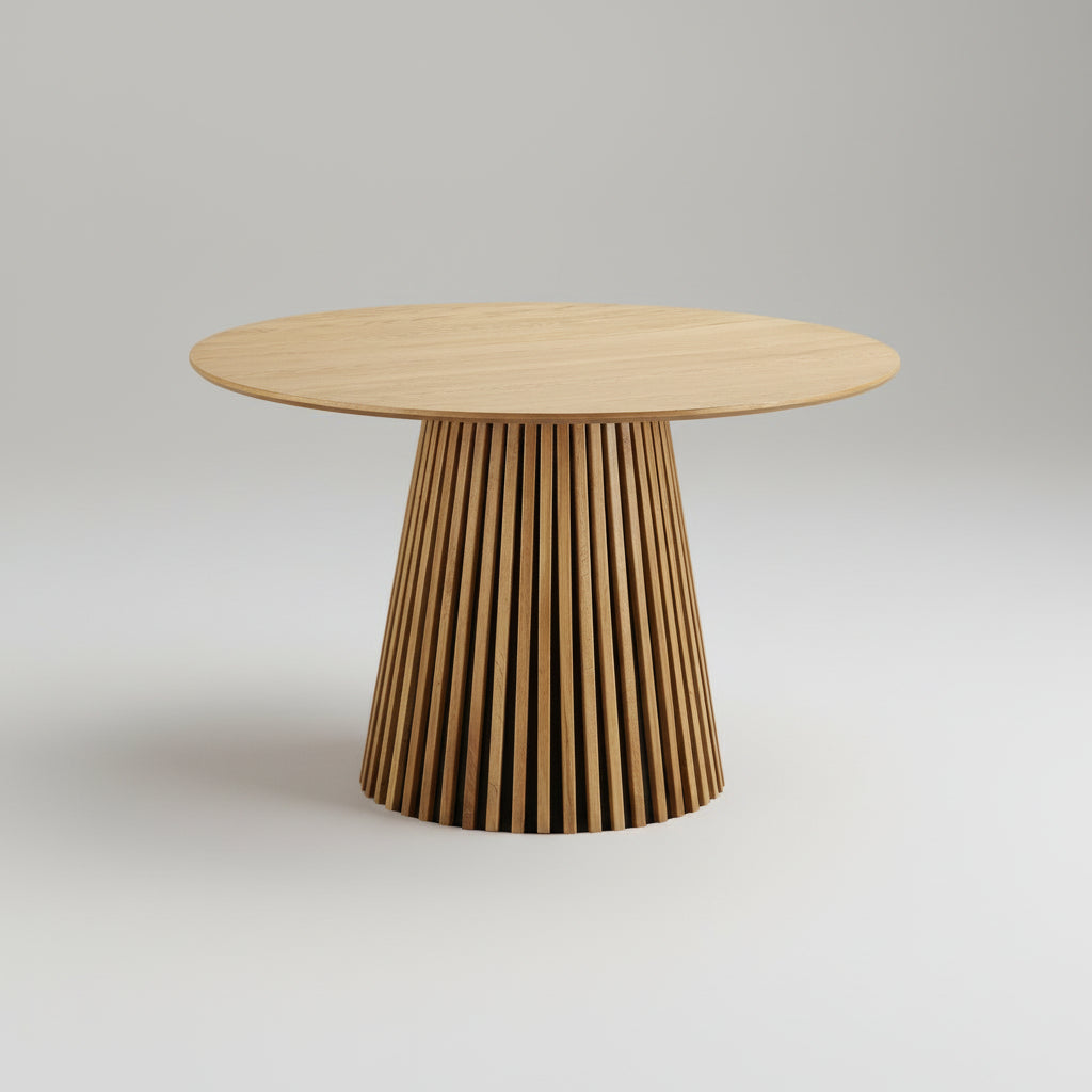 Lamellsokkelen i tre gir bordet både stabilitet og et skulpturelt uttrykk som skiller seg ut i rommet. Overflaten i natur eikefiner har en varm og organisk tone som tilfører harmoni og gjør bordet enkelt å kombinere med ulike interiørstiler.