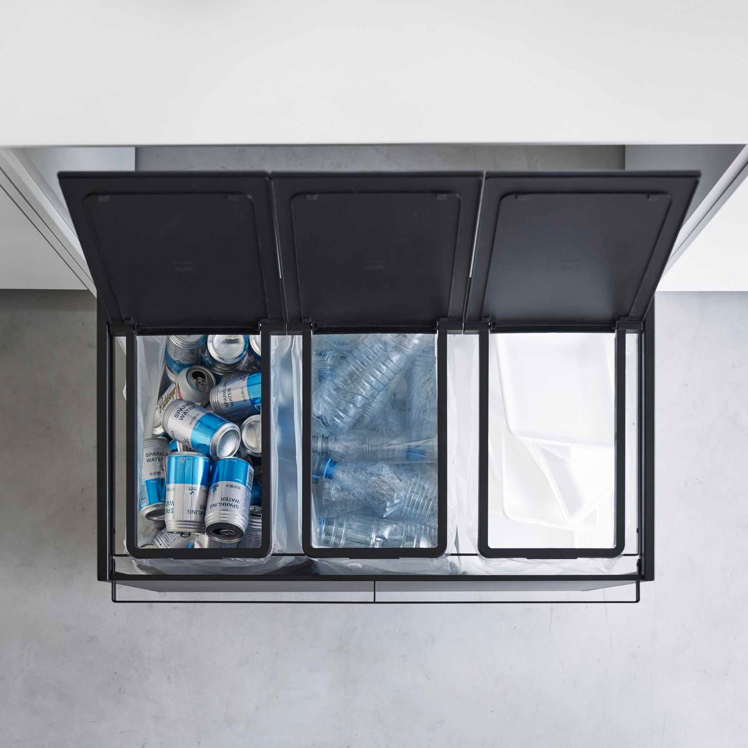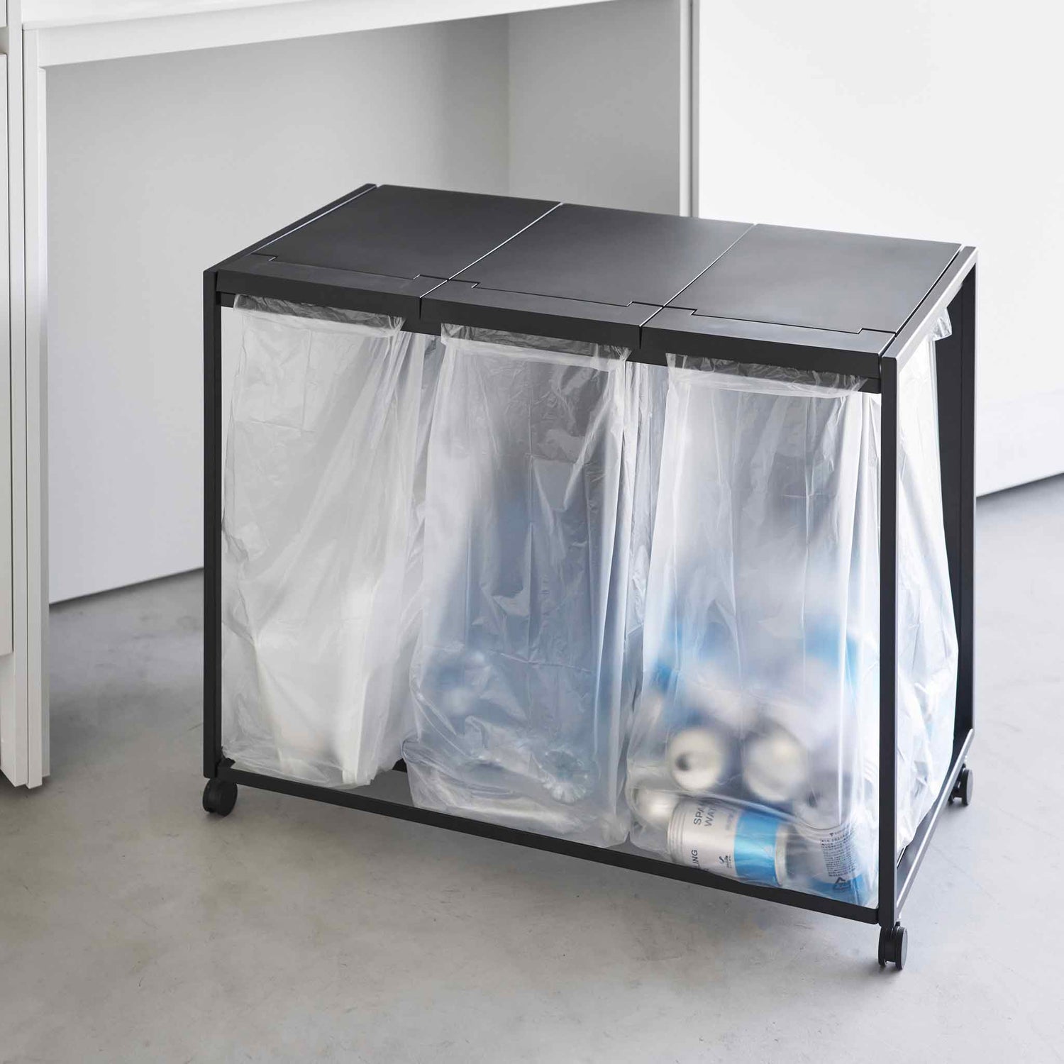 Tre separate rom gjør det enkelt å sortere plast, restavfall og papir i én løsning. Stativet er designet for vanlige avfallsposer som festes direkte på rammen, slik at du slipper tunge innerbøtter. Når posen er full tar du den enkelt av og setter på en ny.