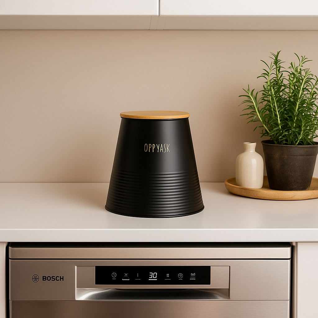 Boks til oppvaskmiddel i sort metall med bambus lokk. Denne flotte boksen har moderne og stilfult design og kan godt stå fremme på kjøkkenbenken til pynt.