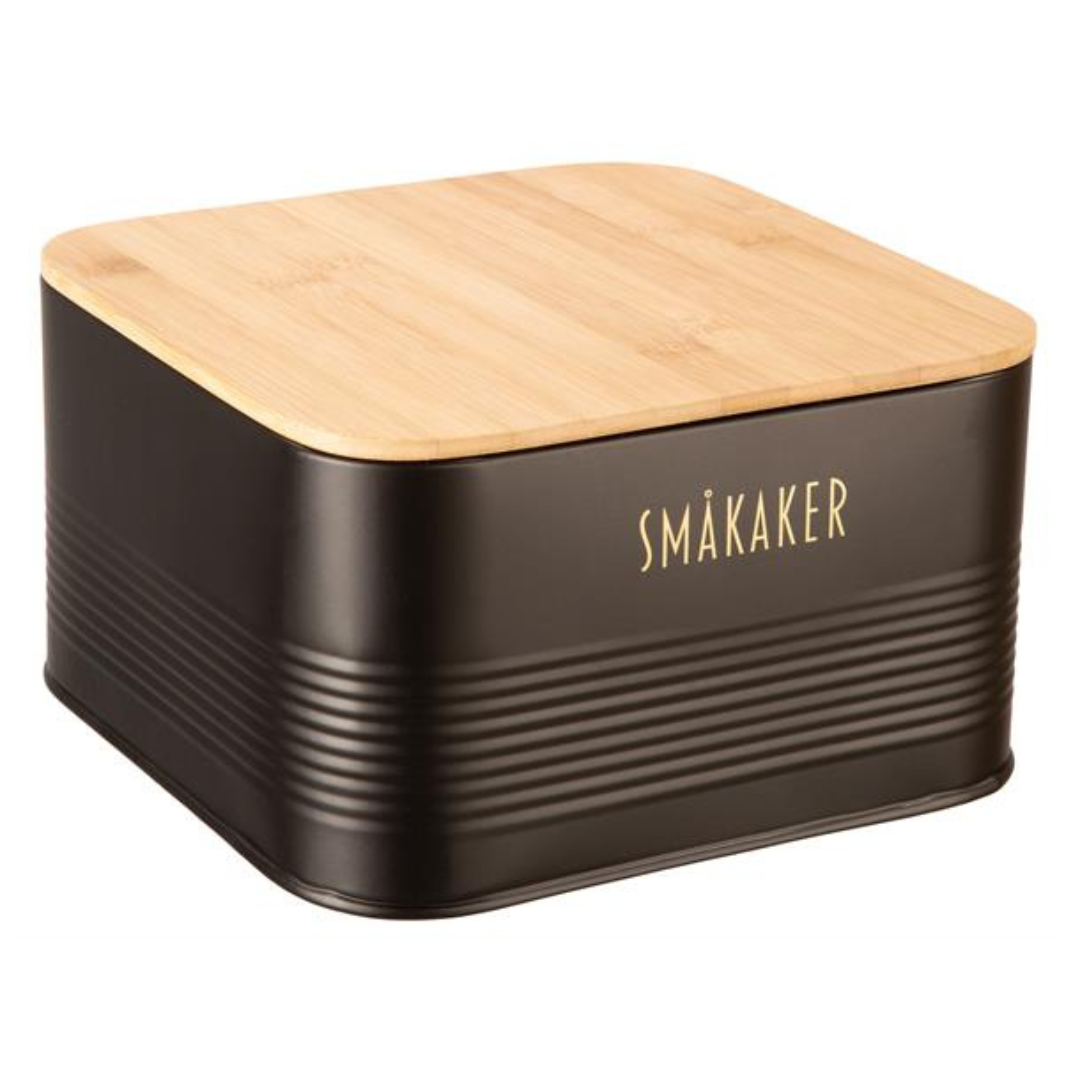 Boks til småkaker i sort metall med bambus lokk. Denne boksen er tett slik småkakene holder seg sprø. Boksen har en moderne sog stilful look og ser flott ut på kjøkenbenken.