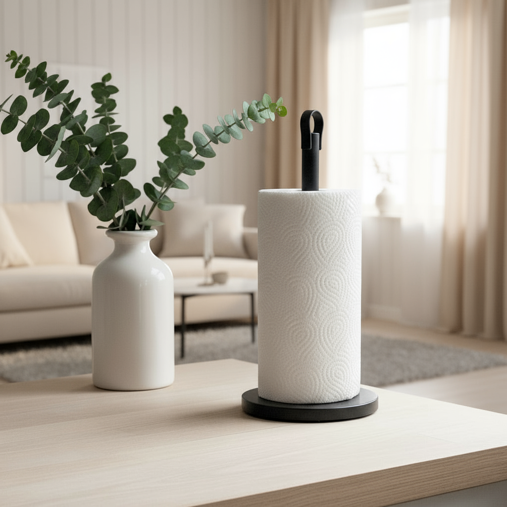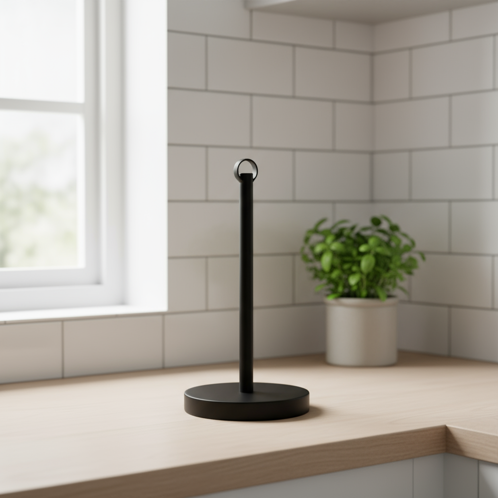 Hold orden på kjøkkenet med denne enkle og moderne tørkerullholderen i sort metall. Den er både praktisk og dekorativ.