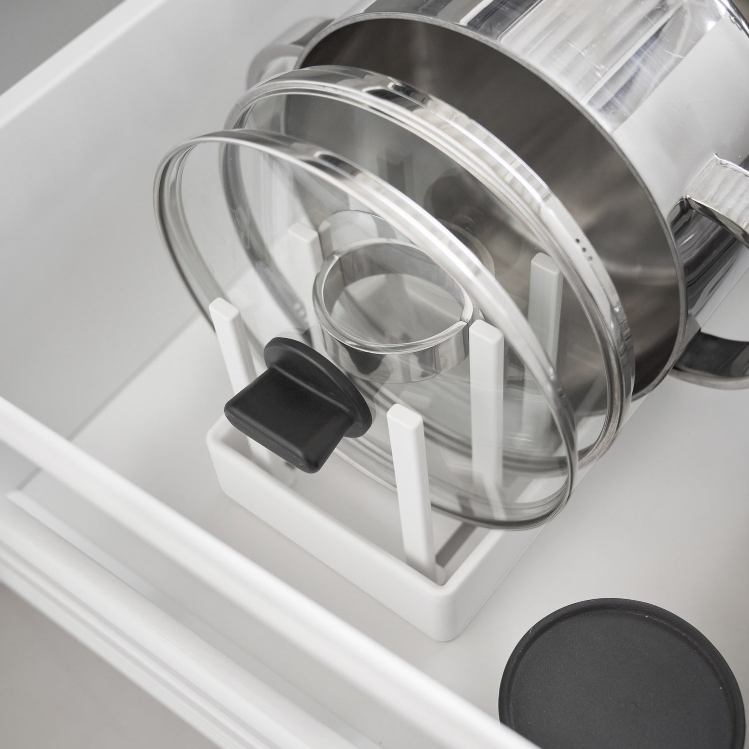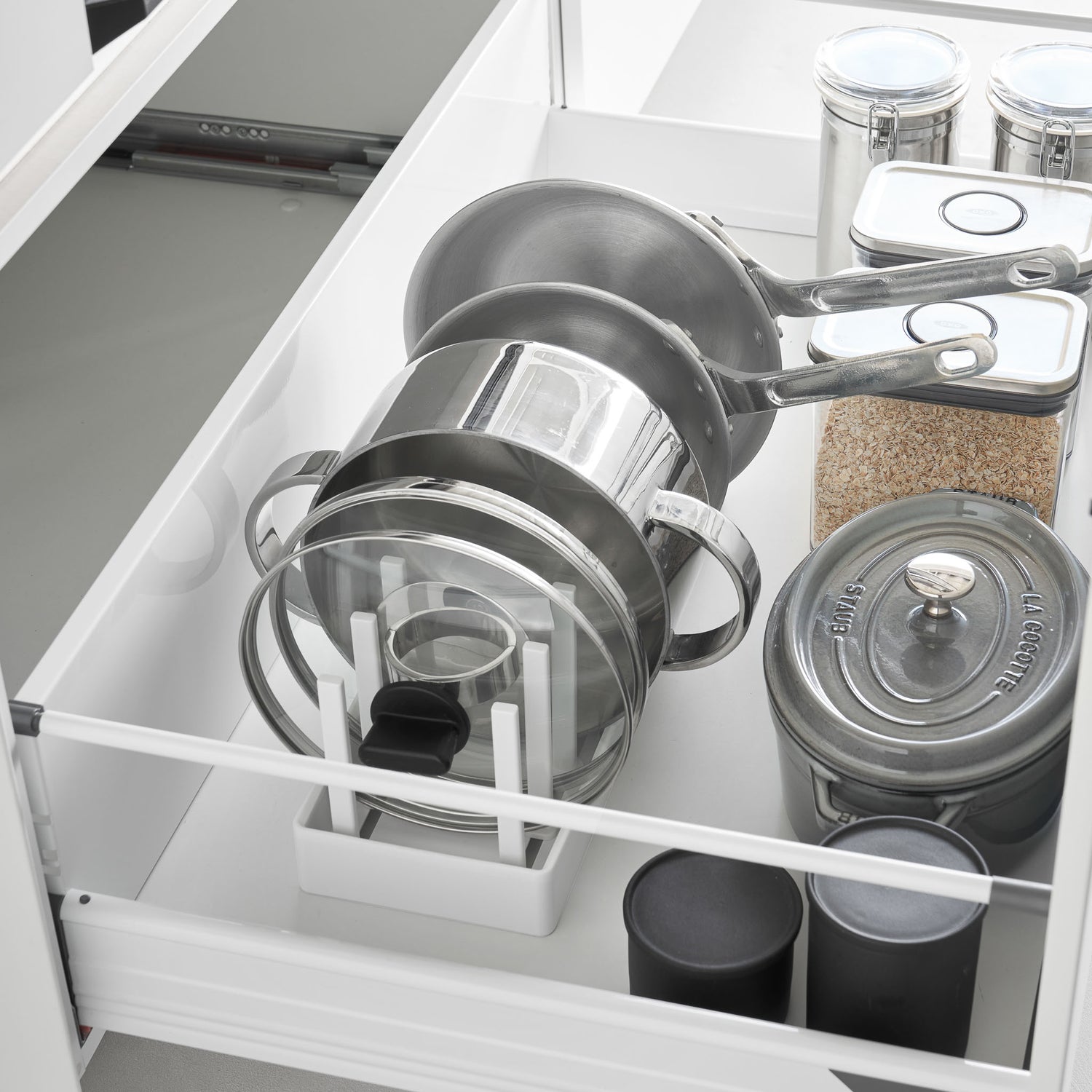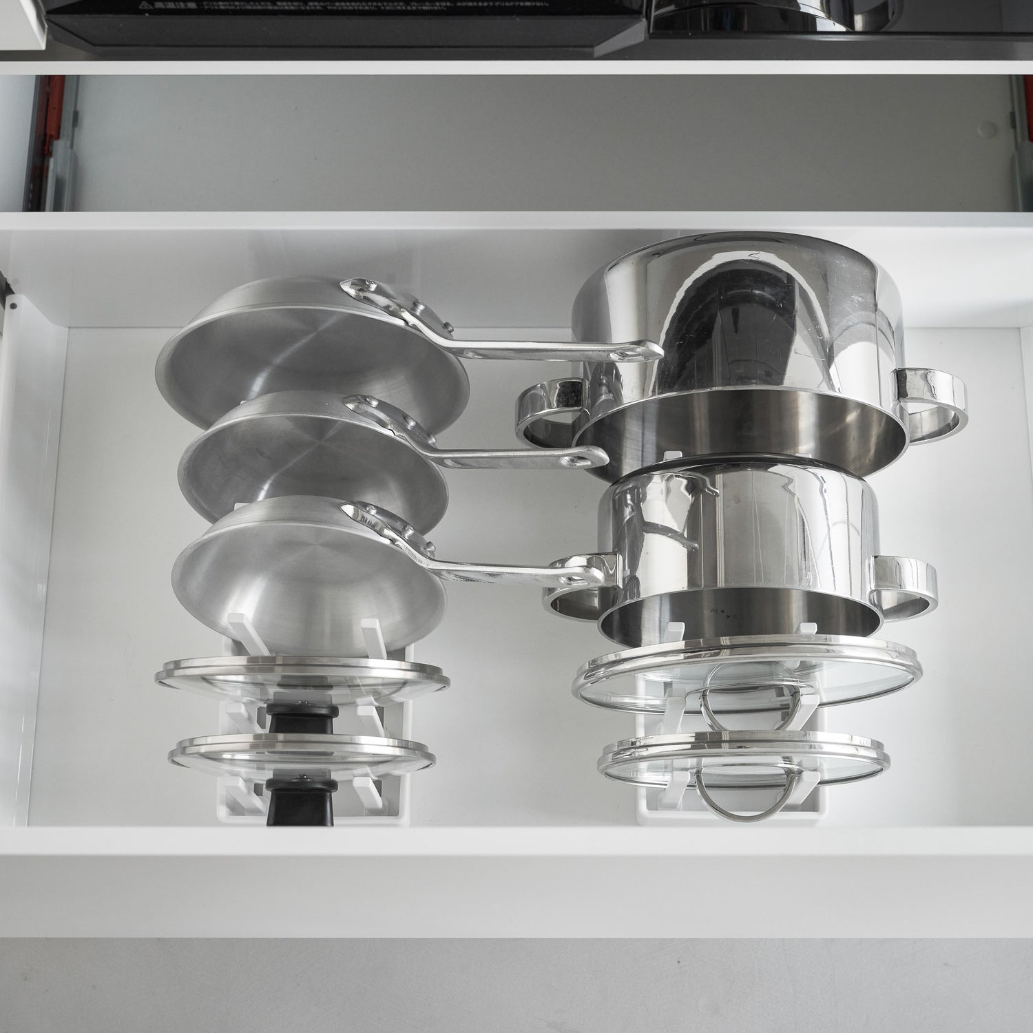 Denne smarte oppbevaringsløsningen holder gryter, panner og lokk organisert på en oversiktlig måte. Skilleveggene kan justeres slik at du enkelt kan tilpasse etter størrelsen på kjøkkenutstyret ditt.