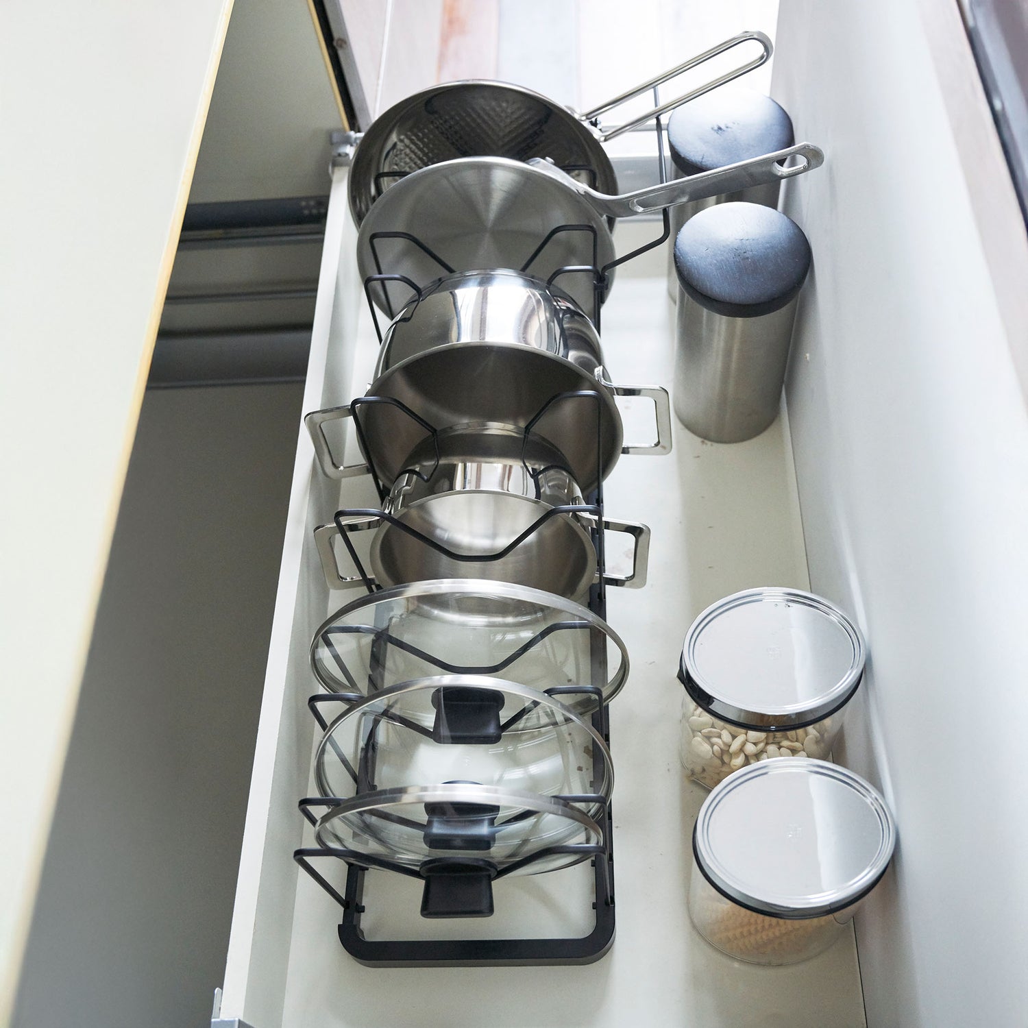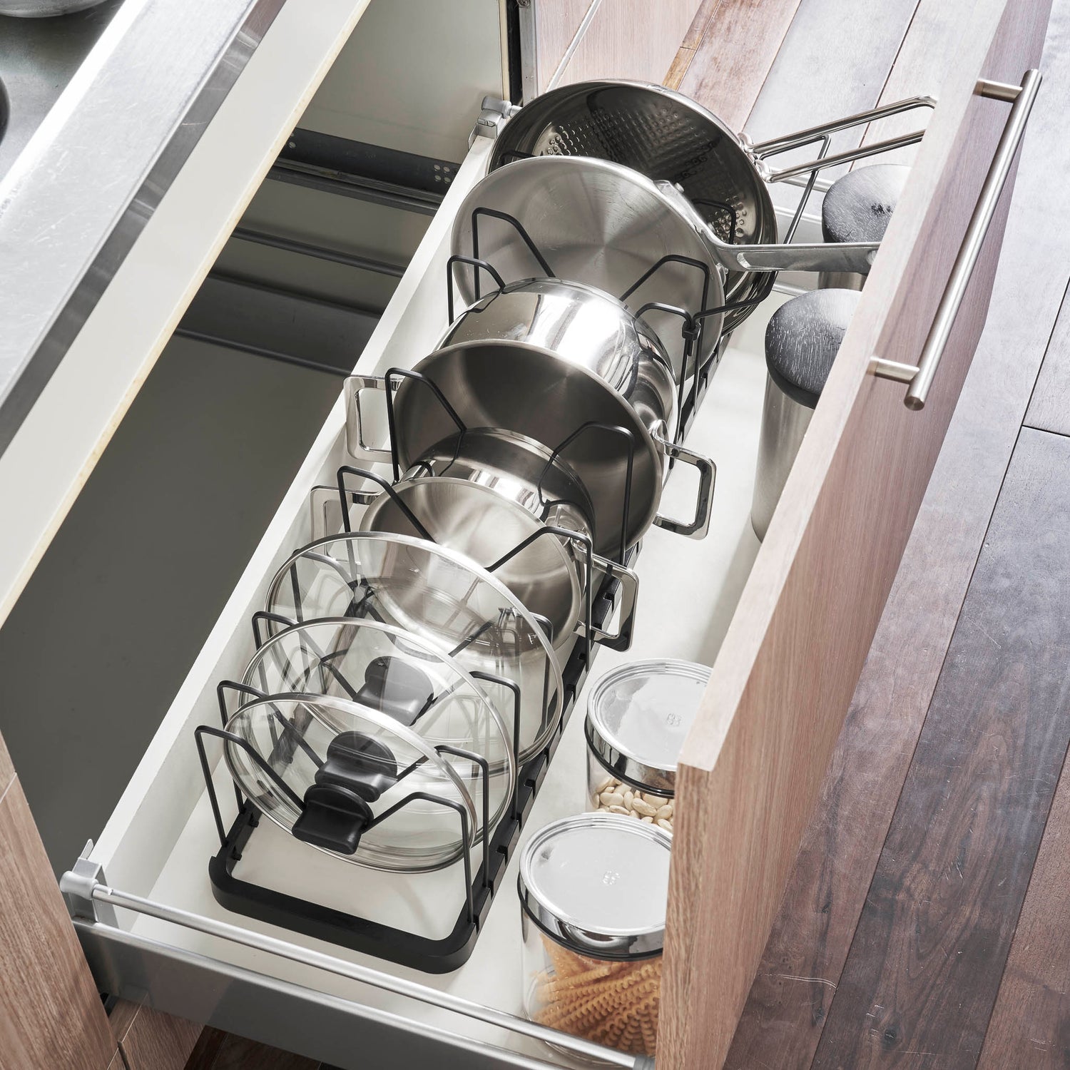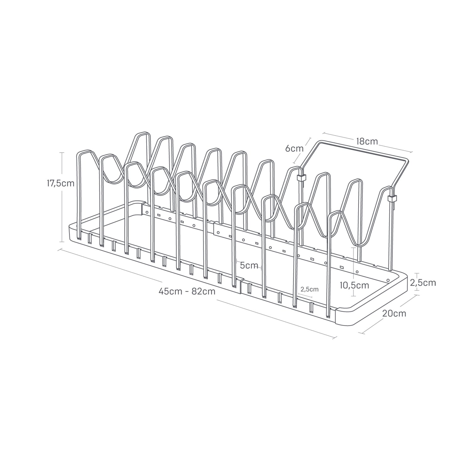 Få orden i kjøkkenskapet med denne justerbare lokk- og panneholderen i sort – en praktisk og stilren løsning for deg som ønsker bedre oversikt og mer plass.