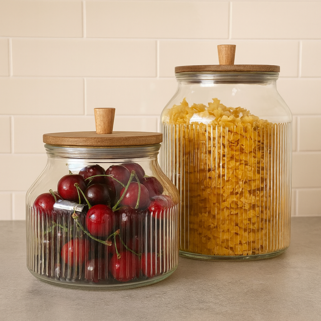 Sett med to oppbevaringskrukker i rillet glass med lokk i tre, fylt med pasta og kirsebær. Perfekt til kjøkkenbenken for oppbevaring av tørrvarer som havregryn, kaffe eller snacks.