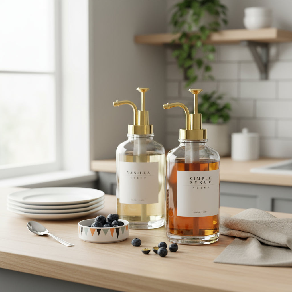 Sett et eksklusivt preg på frokostbordet eller kjøkkenbenken med disse sirupdispenserne i glass med gullpumpe. Dispenserne kombinerer dekor og funksjon på en flott måte og passer perfekt til sirup, honning, olje eller kaffesirup.