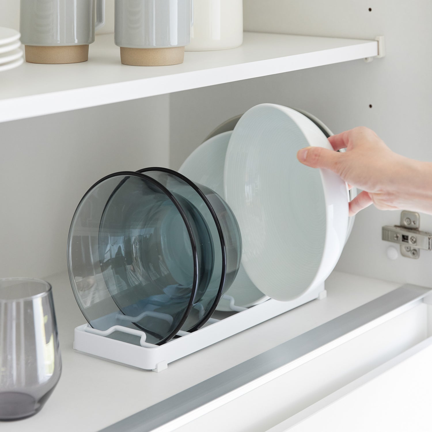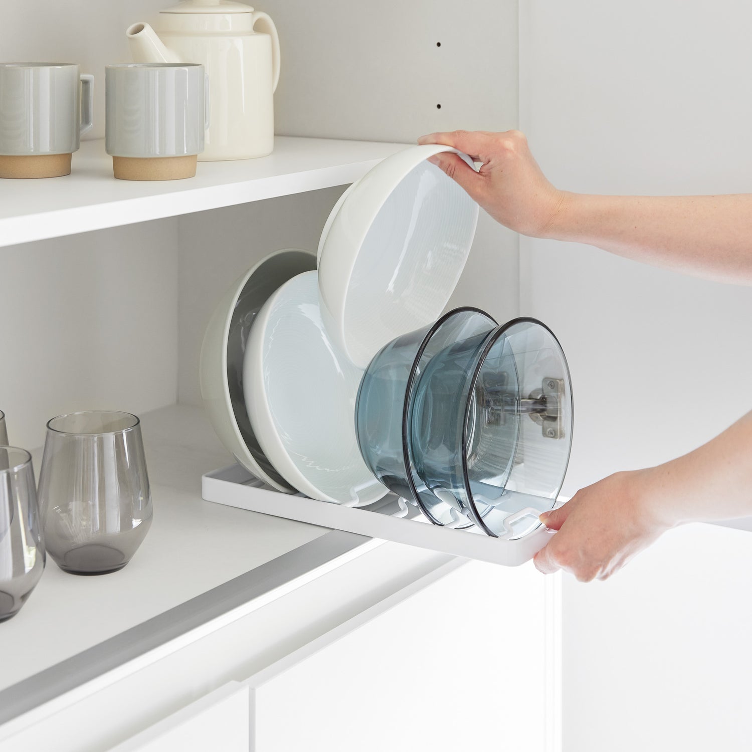 Stativet har plass til opptil seks skåler, avhengig av størrelse og form, og er utstyrt med silikonføtter som sørger for stabilitet og beskytter mot riper. En plassbesparende løsning som holder kjøkkenskap og hyller ryddige og oversiktlige.