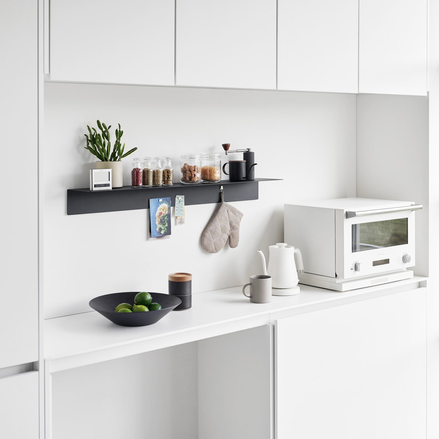 To sorte veggmonterte hyller over toalett med dekor og planter