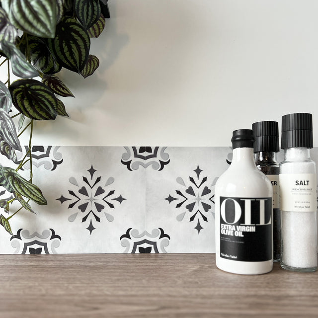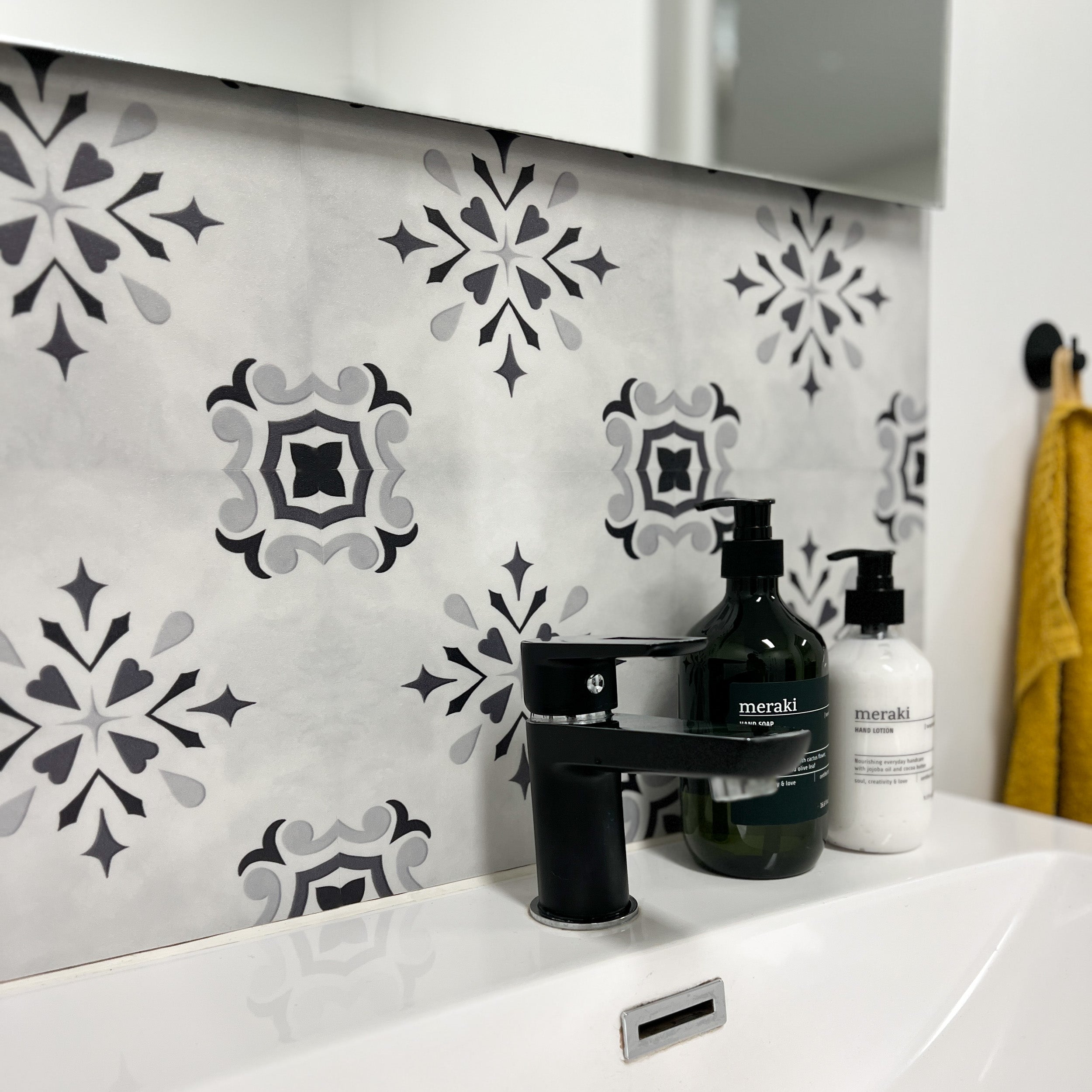 Amilia selvklebende fliser har et historisk design i hvit, grå og sort.