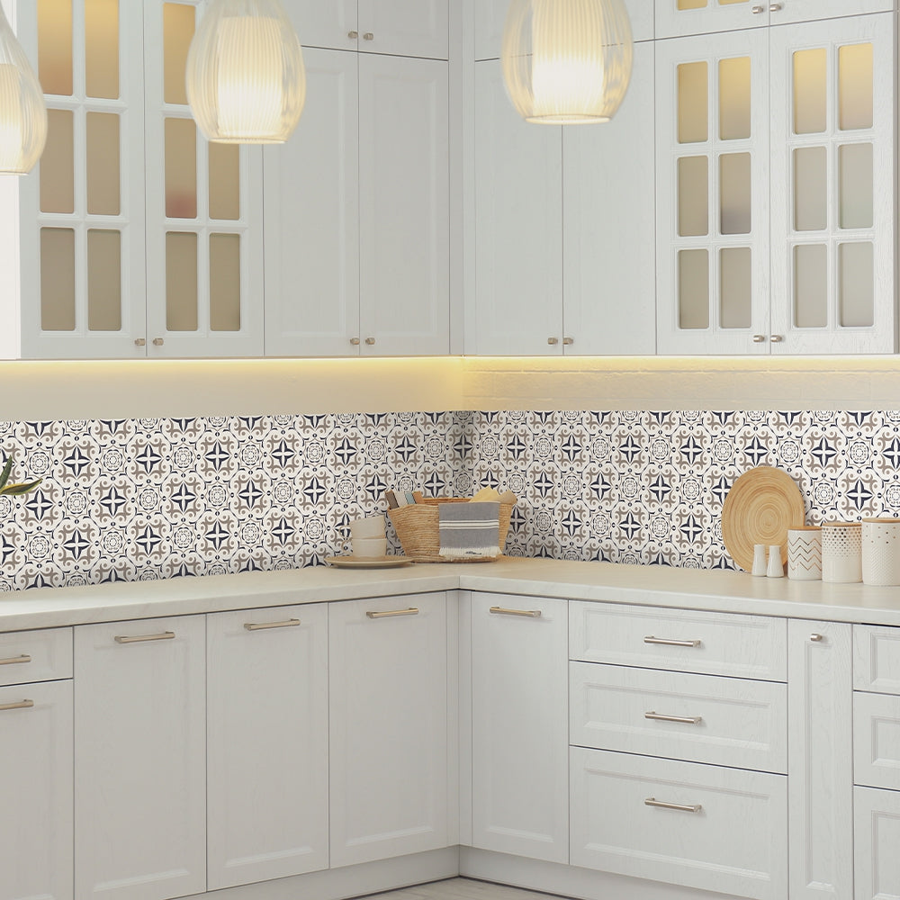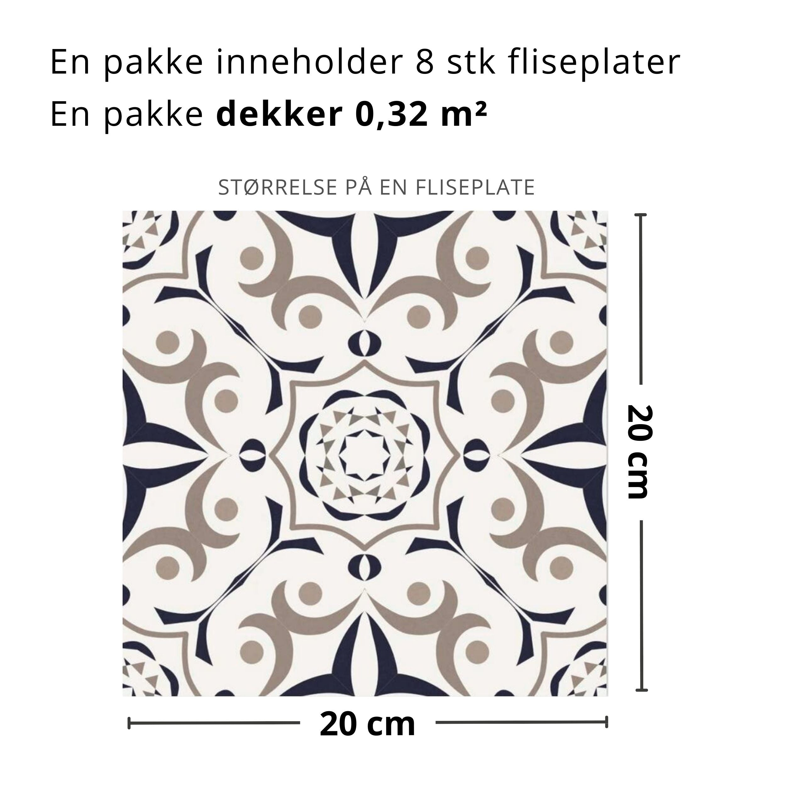 Barcelona selvklebende fliser har et unikt design i blått, hvitt og beige.
