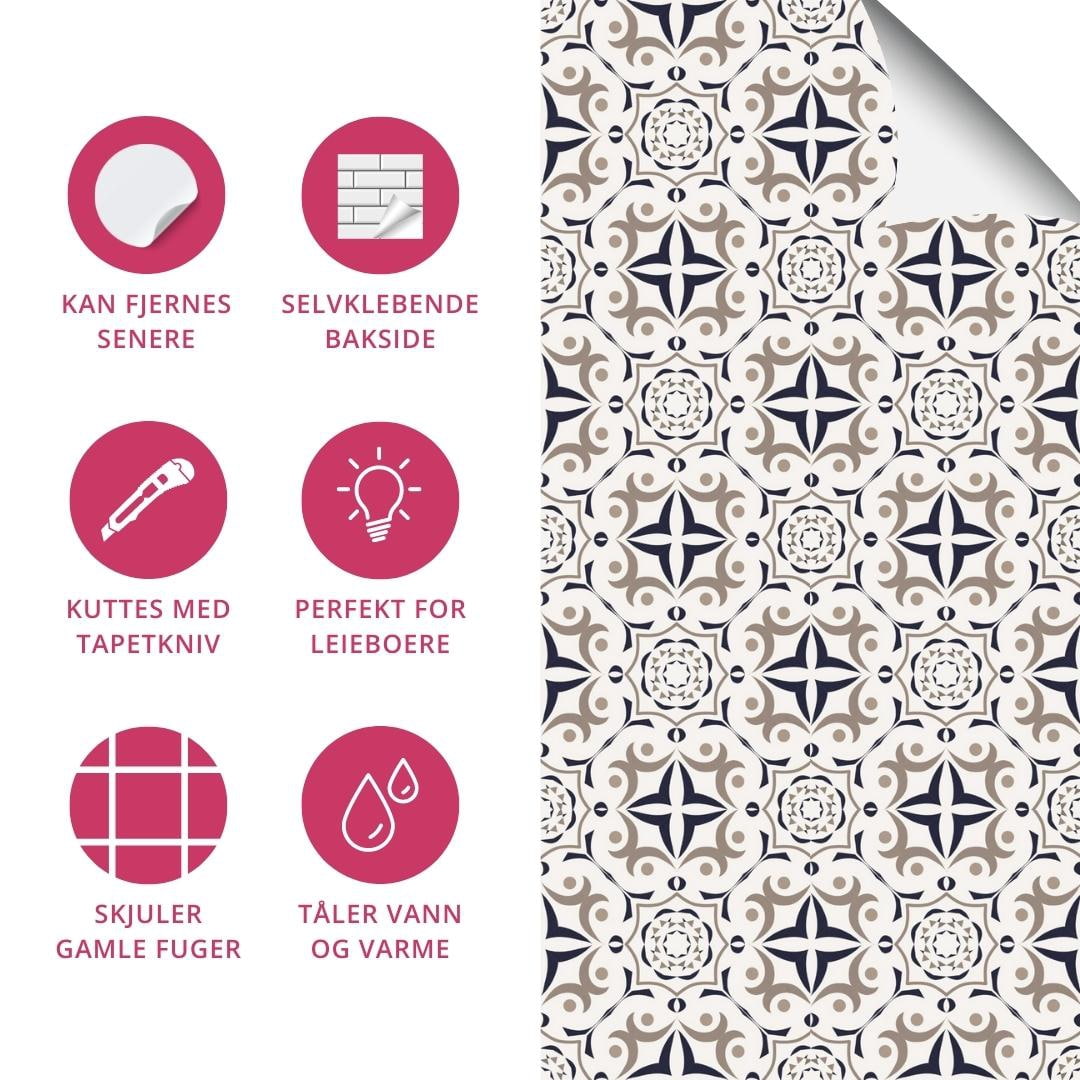 Det vil da si at nå slipper du unna totalrenovering, male gamle veggfliser, dyre kostnader, spesialverktøy, fuging og store prosjekter. Du sparer både tid og penger når du velger selvklebende fliser.
