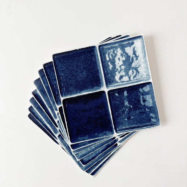 Ezra dyp blå selvklebende fliser imiterer kvadratiske glassfliser i en dyp blå farge. Pakken består av 8 fliser med 2 variasjoner som gjør at du får et naturlig resultat når flisene monteres.