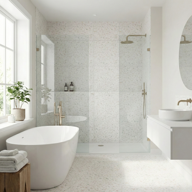 Lisboa Terazzo-flisene kan enkelt tilpasses med saks eller tapetkniv 40 x 40 cm, og passer derfor like godt på små veggflater som større prosjekter. Det hvite terazzomønsteret gir et lyst og luftig uttrykk som passer perfekt i både moderne og klassiske interiør.