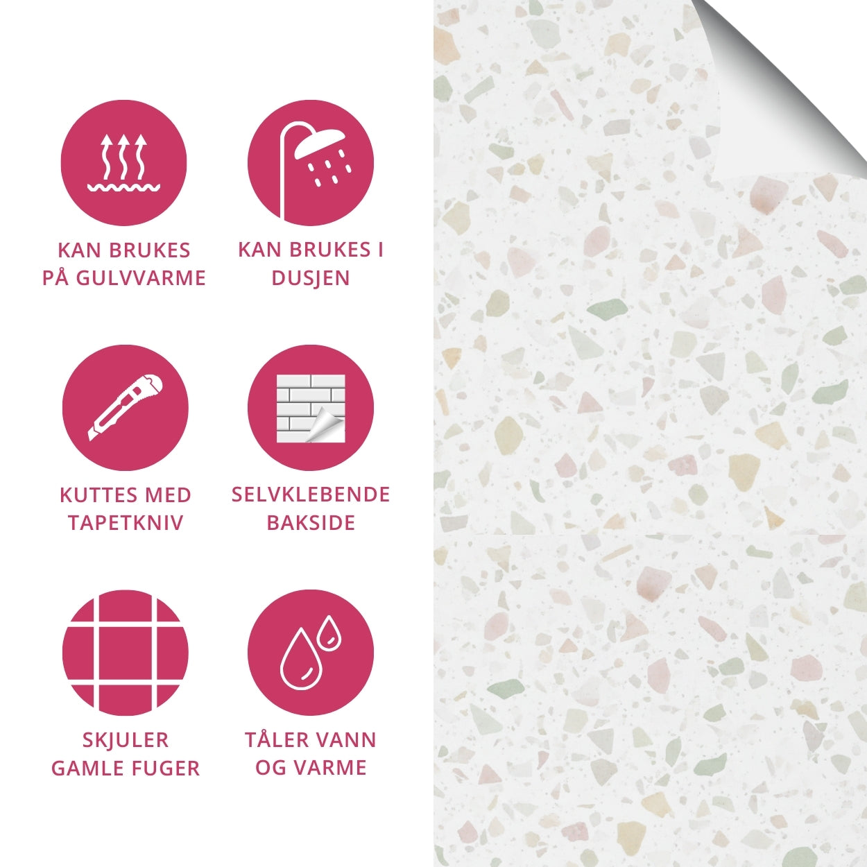 Gi kjøkkenet eller badet et nytt og moderne preg på minutter med Lisboa Terazzo selvklebende fliser. Disse elegante flisene har et klassisk terazzomønster i hvitt med subtile spetter som gir et tidløst og sofistikert uttrykk.