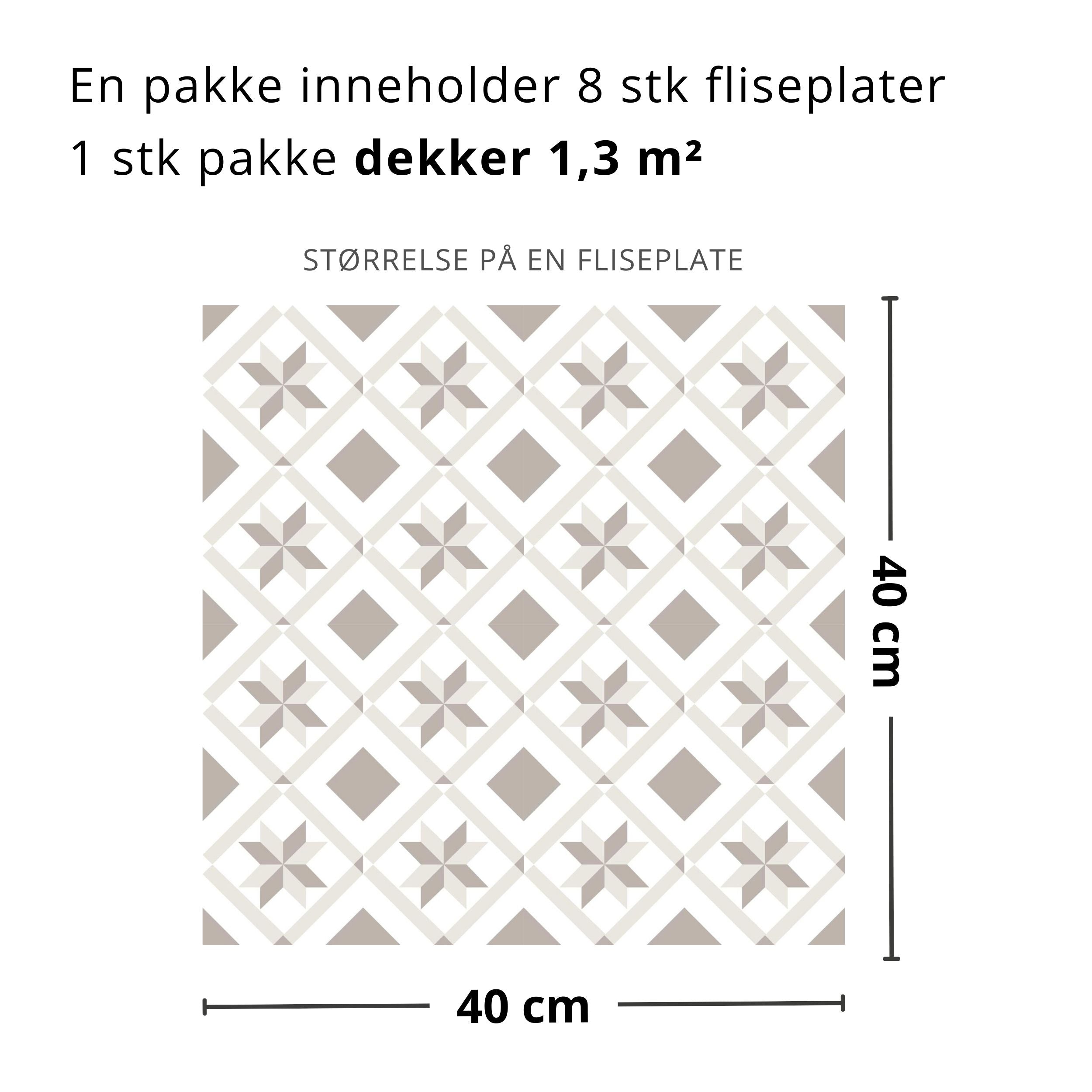 Oslo mini er moderne selvklebende fliser med historisk design inspirert av stjernemønster og flettede detaljer. Flisene passer perfekt for deg som ønsker å fornye kjøkken, bad eller vaskerom uten bruk av verktøy eller lim.