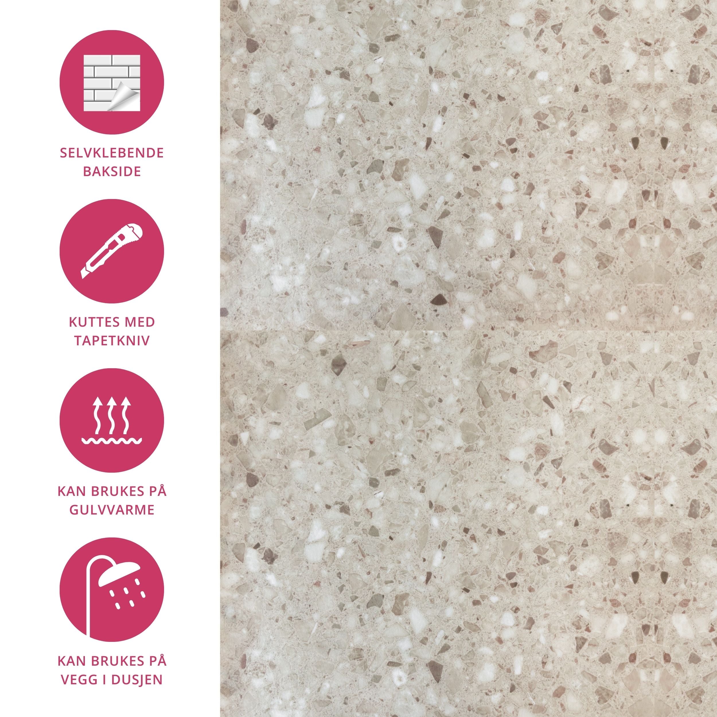 Har du lyst på nytt gulv på badet? Eller kanskje du har lyst på nye fliser i dusjen? Endelig er løsningen her! Disse innovative selvklebende flisene kan festes rett på ditt gamle underlag, til og med på gulv med varme, laminat og i dusjsonen. Ja - du leste riktig! Disse flisene kan brukes på alle slette underlag på både vegg og gulv.