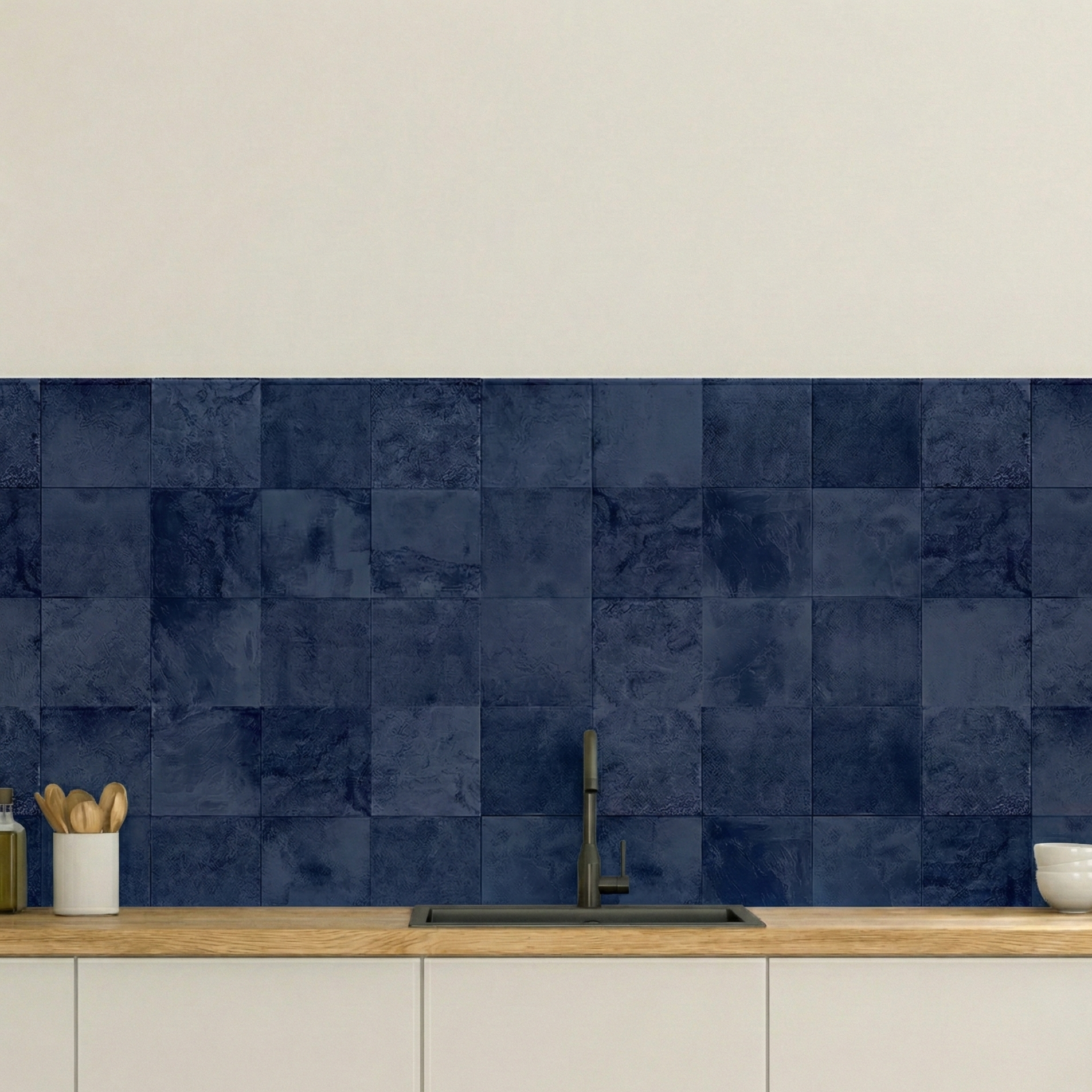 Flisene er laget med slitesterk overflate som tåler fukt, fett og daglig bruk, og den kraftige limsiden gjør at de sitter godt på de fleste glatte underlag. Bodø mørkeblå-flisene kan enkelt tilpasses med saks eller tapetkniv, og passer derfor like godt på små veggflater som større prosjekter.
