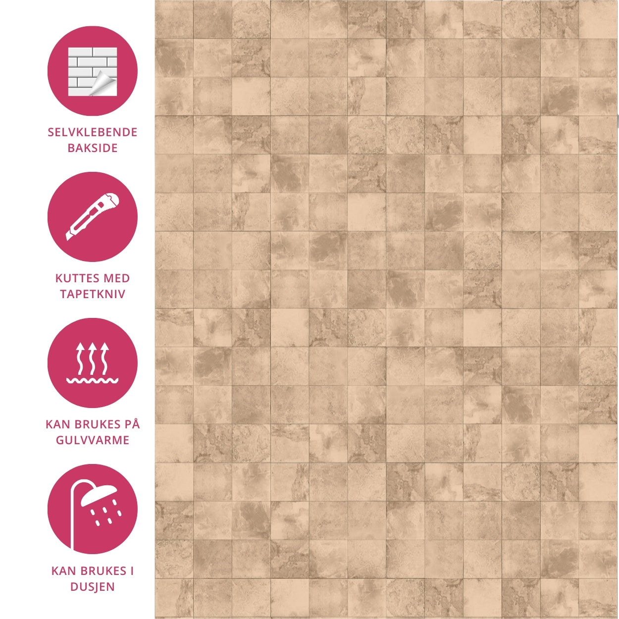 Forny gulv eller vegger på minutter med Bodø sand selvklebende fliser. Disse kvadratiske 40 x 40 cm flisene har et varmt, sandfarget uttrykk inspirert av naturlig stein.