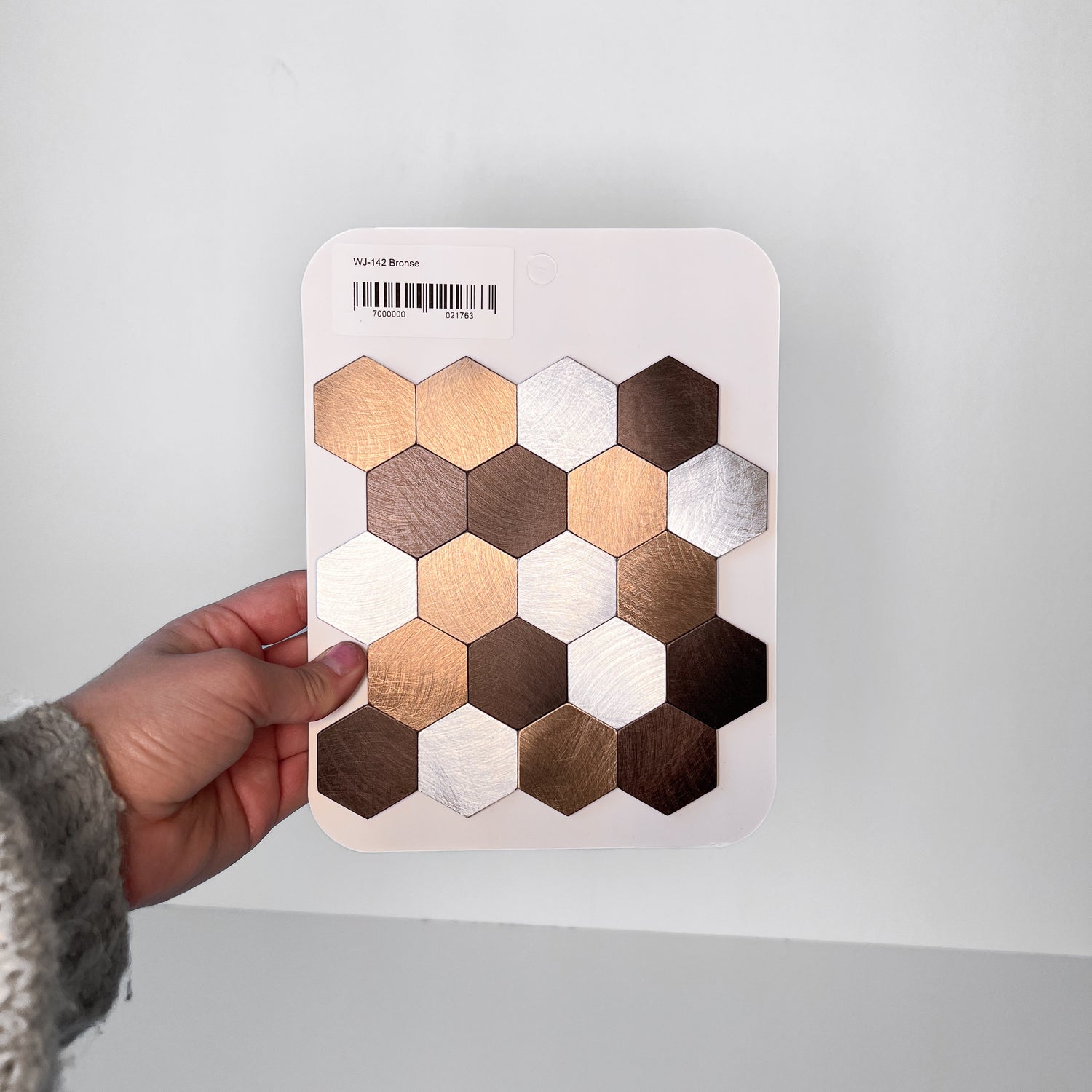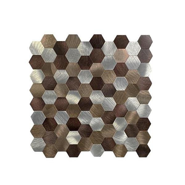Vareprøve på 14 x 14,5 cm av Premium selvklebende hexagon veggfliser i nydelige bronsetoner.