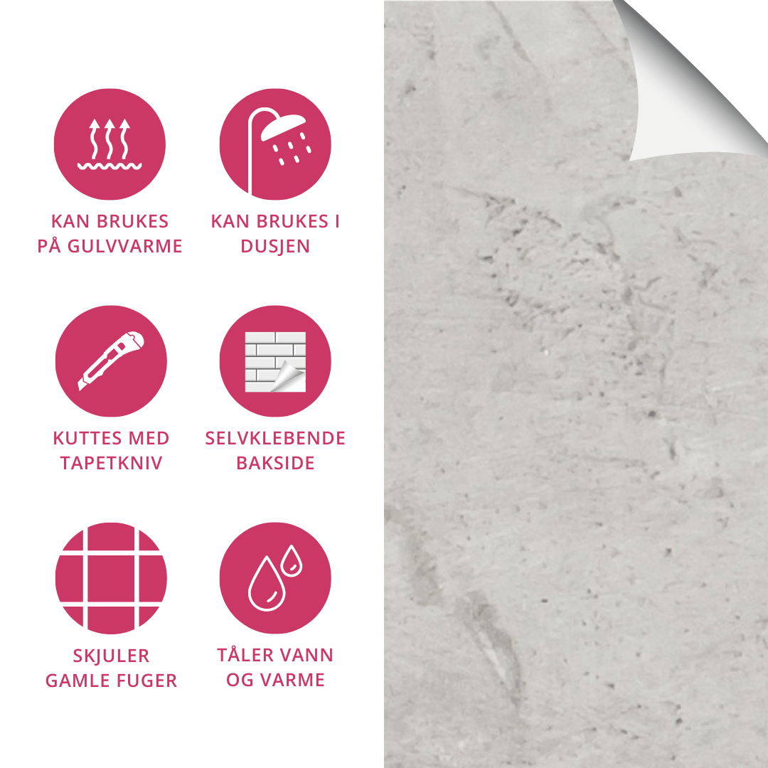 Dette er en vareprøve av Amsterdam selvklebende fliser. Amsterdam selvklebende fliser etterligner grå betong. Flisene har et moderne og tidløst design som tar seg godt ut i nordiske hjem.