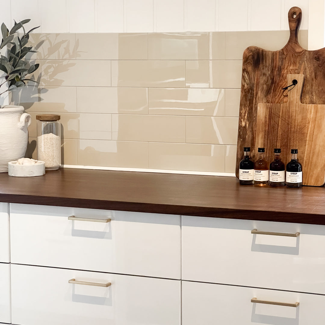 Flisene har et silkemykt, glansfullt belegg som reflekterer lys og gjør rommet større, samtidig som de tåler hverdagsbruk, fukt og varme.