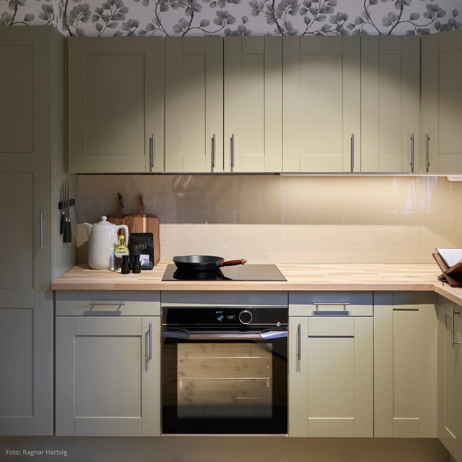 Flisene gir et varmt, nordisk preg som passer perfekt til de grønne frontene og de lyse tretonene på benkeplaten.