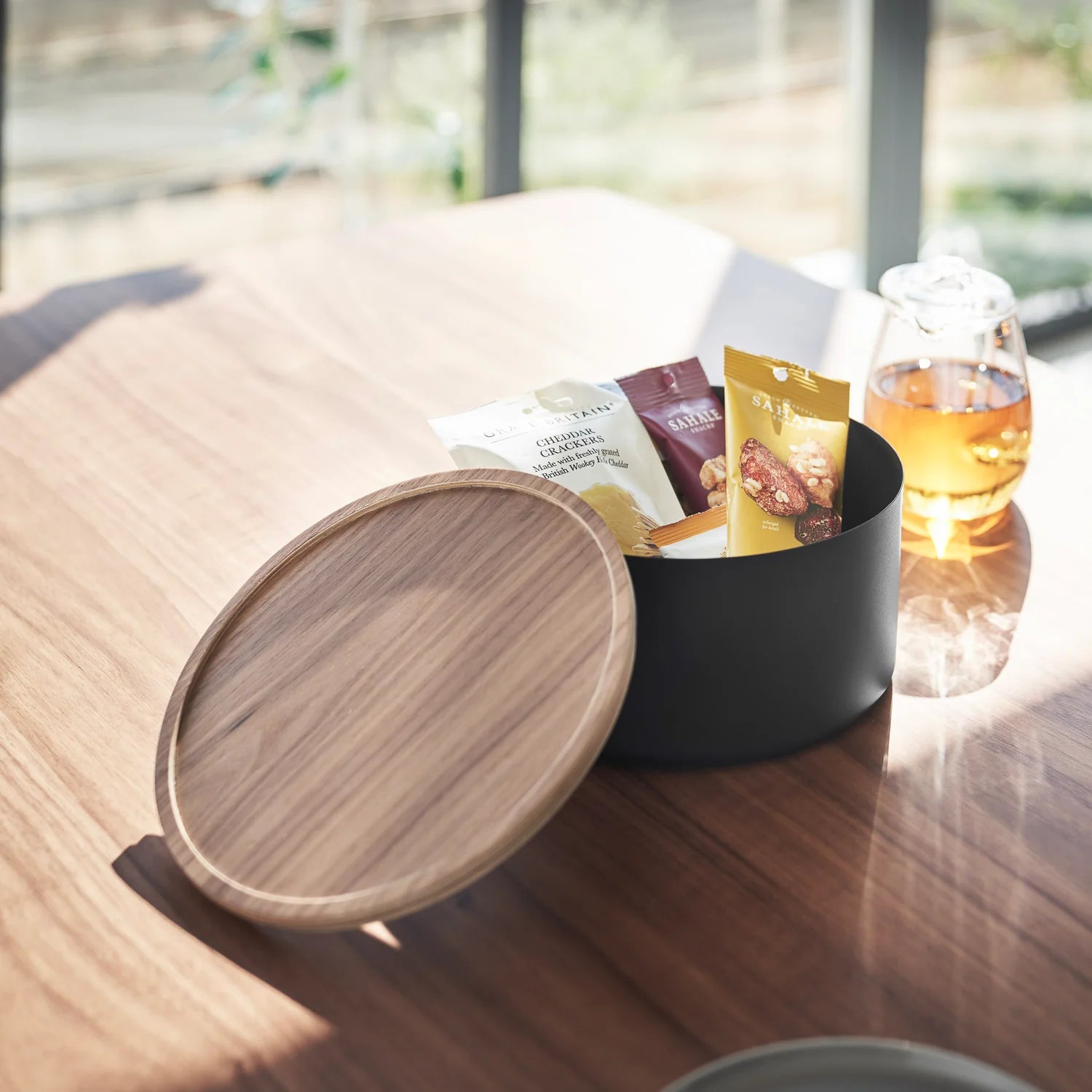 Dette settet inneholder to stilrene oppbevaringsbokser fra Yamazaki i ulike størrelser. Boksene har et minimalistisk design med matt sort finish og lokk i tre som gir et varmt og moderne uttrykk.