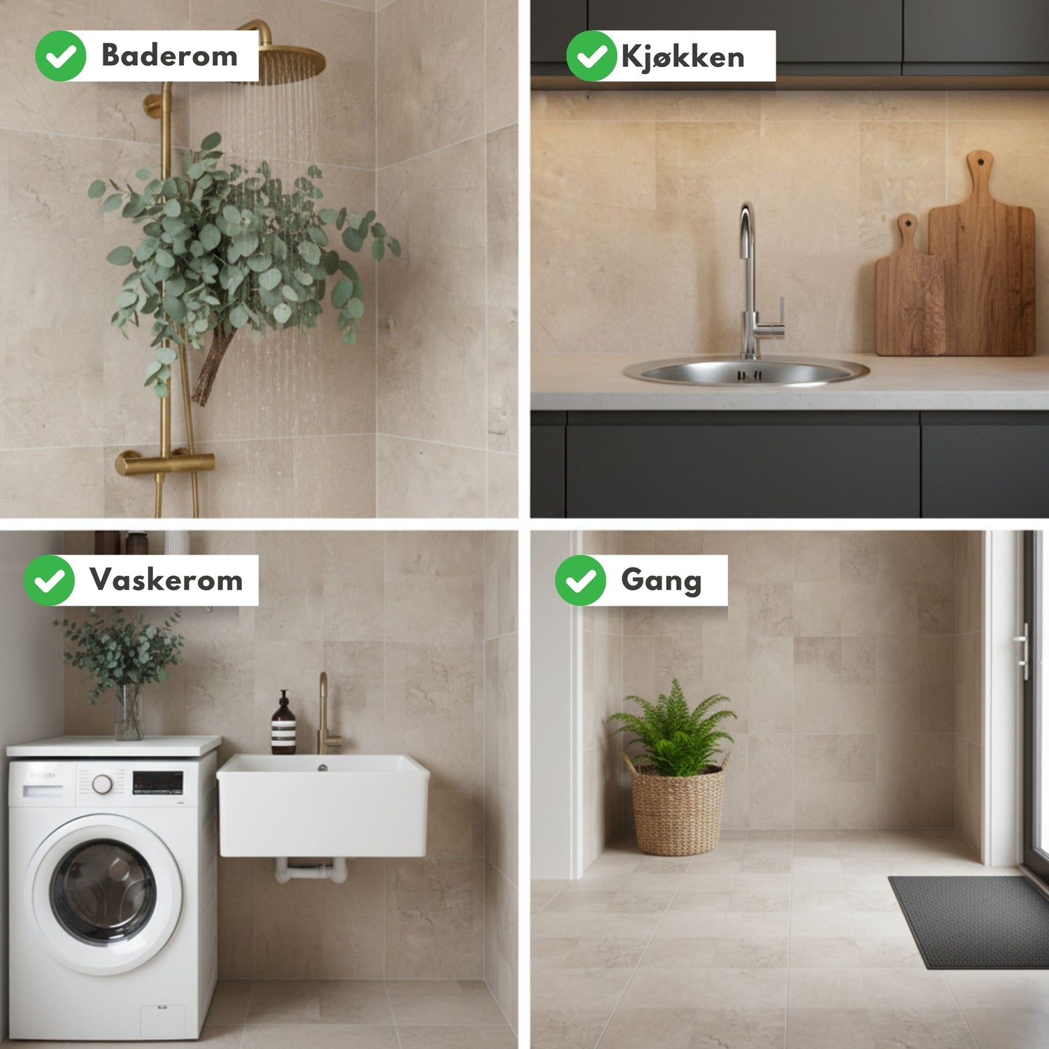 Leah passer perfekt til kjøkken, gang og vaskerom hvor du ønsker et rolig og helhetlig uttrykk. Den fungerer også svært godt på bad, både på gulv og vegg, og gir et rent og oppgradert resultat uten omfattende arbeid. Med selvklebende bakside får du rask og enkel montering, uten behov for verktøy eller fagfolk.