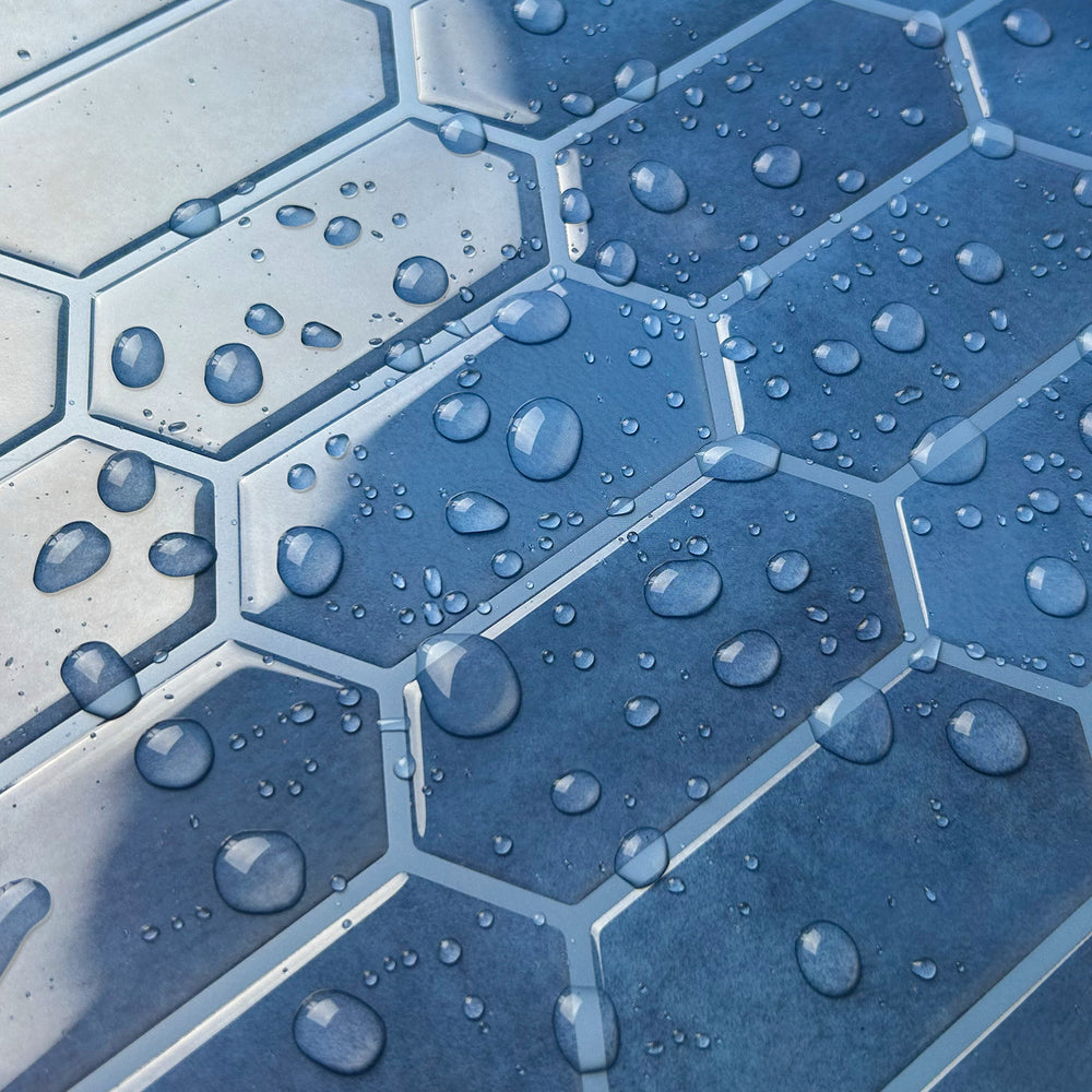 Alexandra blå selvklebende veggfliser kombinerer en dyp blå nyanse med en moderne sekskantet form. Disse flisene gir en oppgradering til kjøkken, bad eller andre rom uten behov for fuging eller lim.