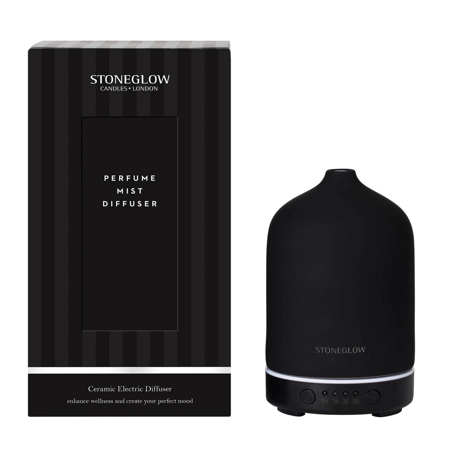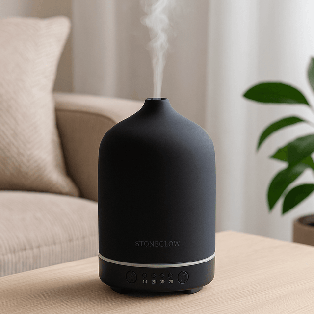 Denne aromadiffuseren i elegant sort sprer en behagelig duft i hjemmet og skaper en avslappende atmosfære.