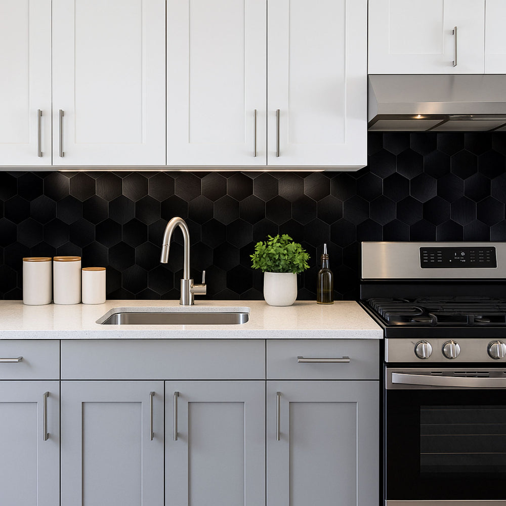 Midnatt Hexagon skaper en moderne og eksklusiv stil med sin dype, mørke overflate og sekskantede form. Flisene passer perfekt til både kjøkken og bad.