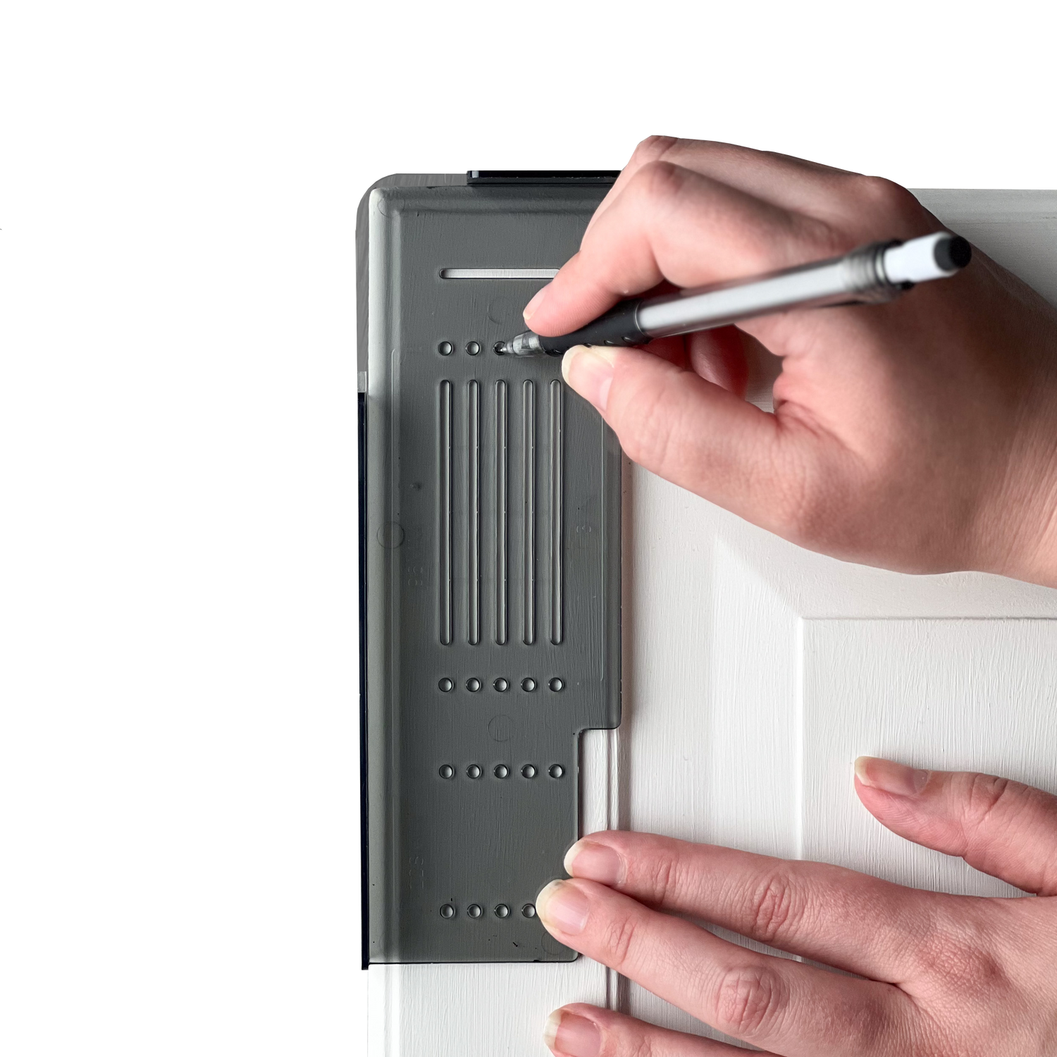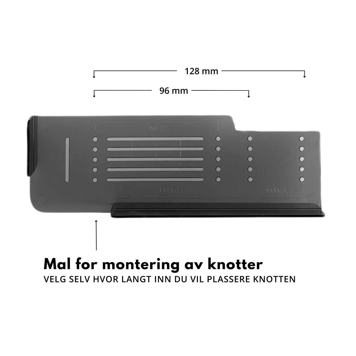 Boremalen er designet for lett montering av både knotter og håndtak. Melen er enkel å bruke og hjelper deg med å bore på rett sted slik at du får samme avstand på hver skapdør og skuffefront. Få den perfekte plasseringen enkelt med denne praktiske boremalen.