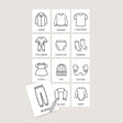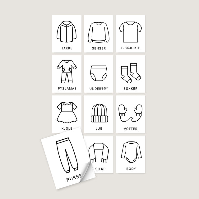 Denne pakken inneholder etiketter til: Bukse, Genser, T-skjorte, Pysjamas, Undertøy, Sokker, Kjole, Lue, Votter, Skjerf, Jakke, Body