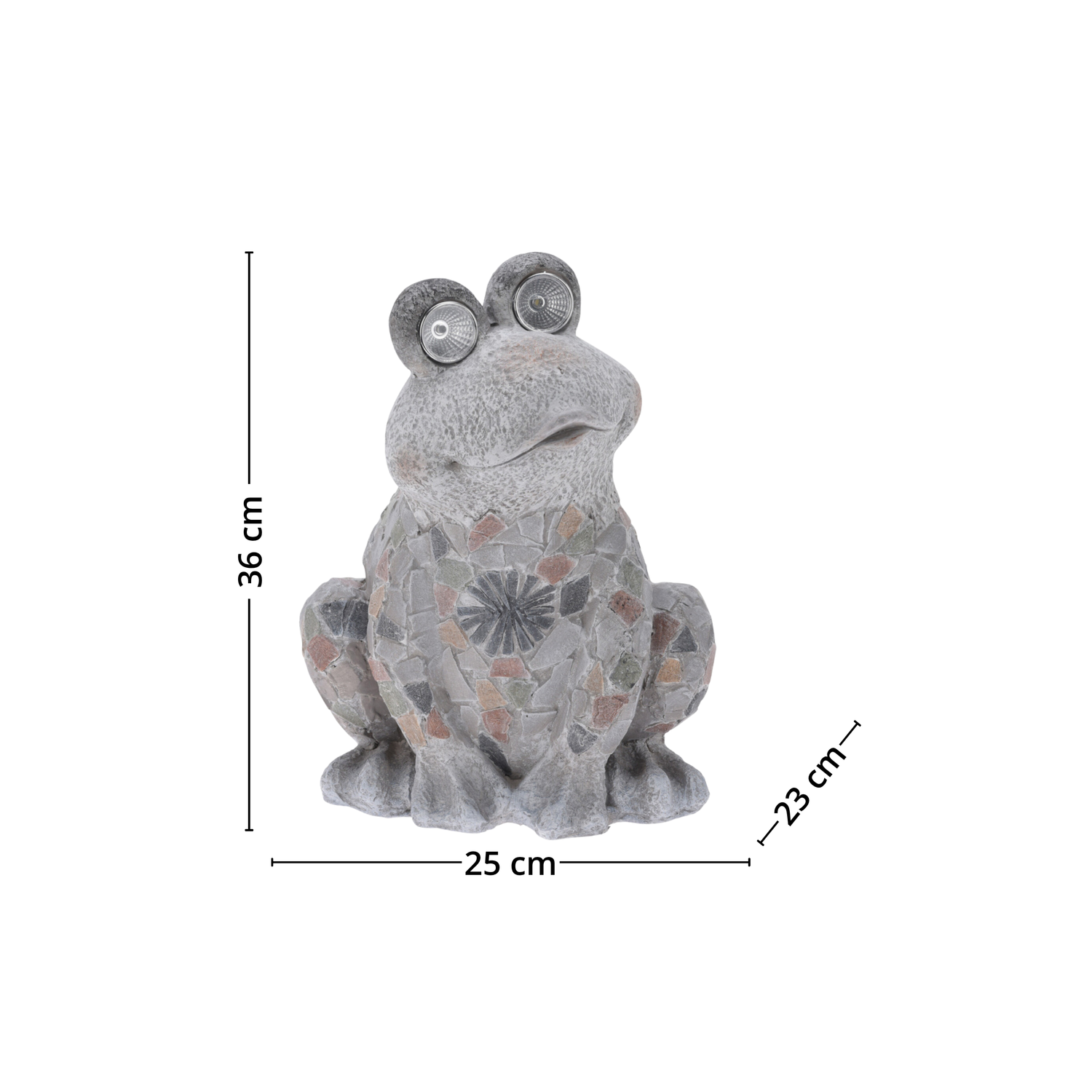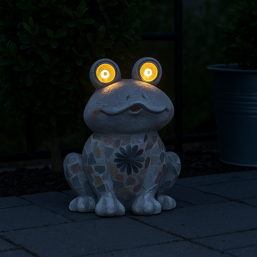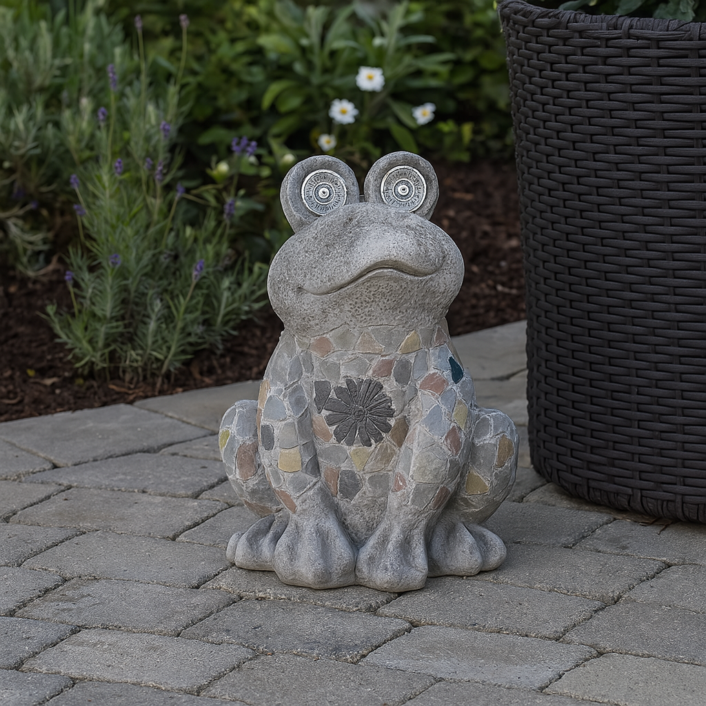 Gi hagen et lekent og dekorativt løft med denne sjarmerende frosken med solcellelys i øynene. Frosken er dekorert med fargerik mosaikk og har innebygde LED-lys som lades opp av solen i løpet av dagen og lyser opp om kvelden.