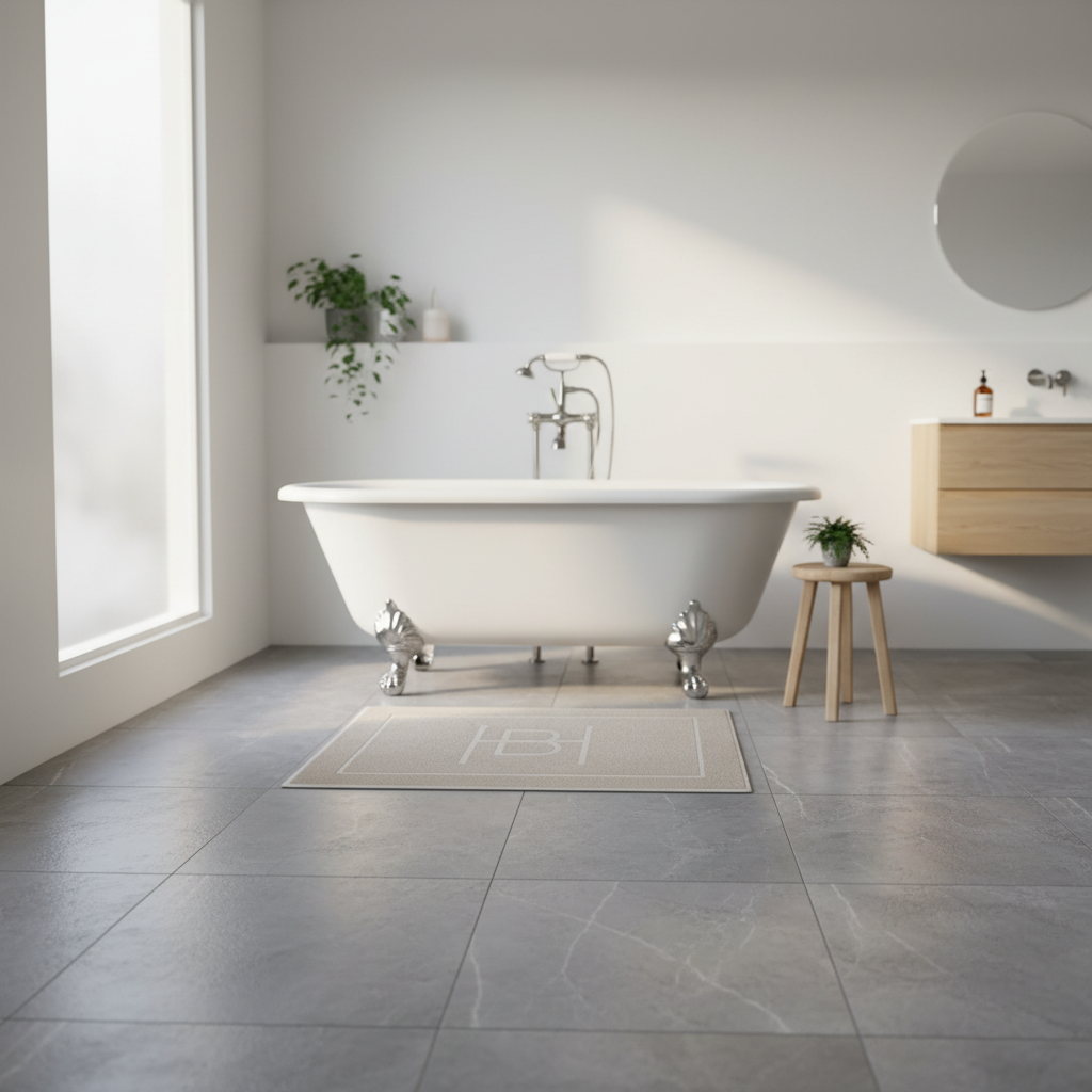 Gi badet et lunere og mer gjennomført uttrykk med Halvor Bakke Clifton badematte i beige. Den rolige fargetonen og det diskrete HB monogrammet gir badematten et eksklusivt preg som passer godt inn i både lyse og mørkere baderom.
