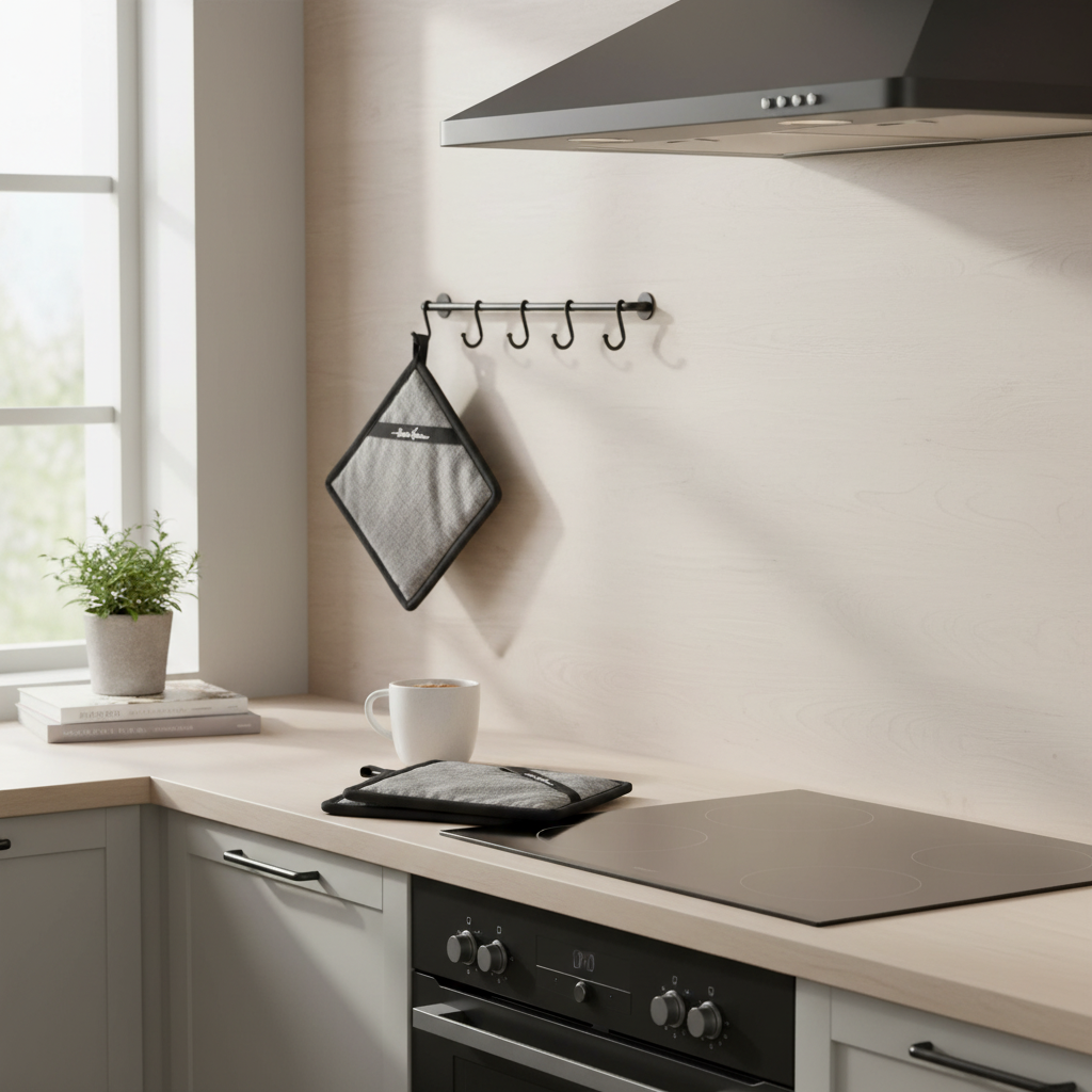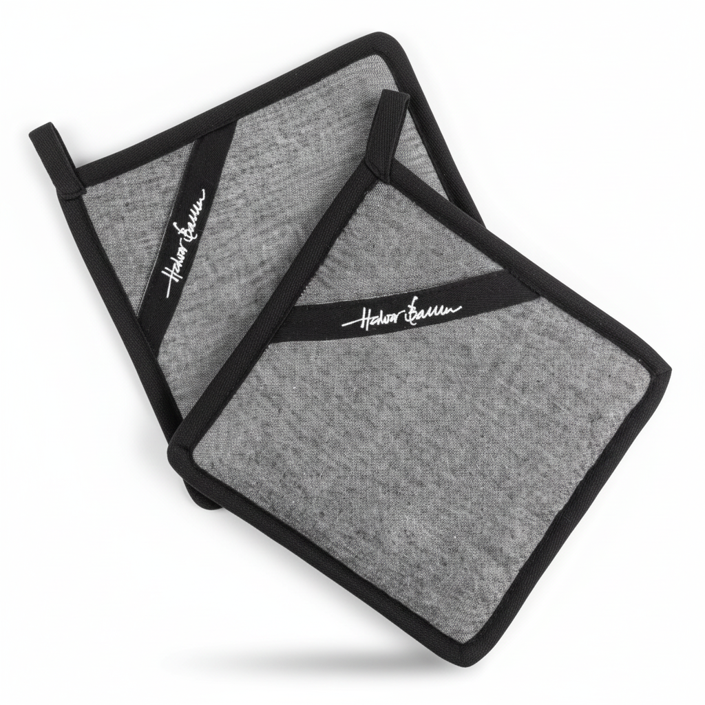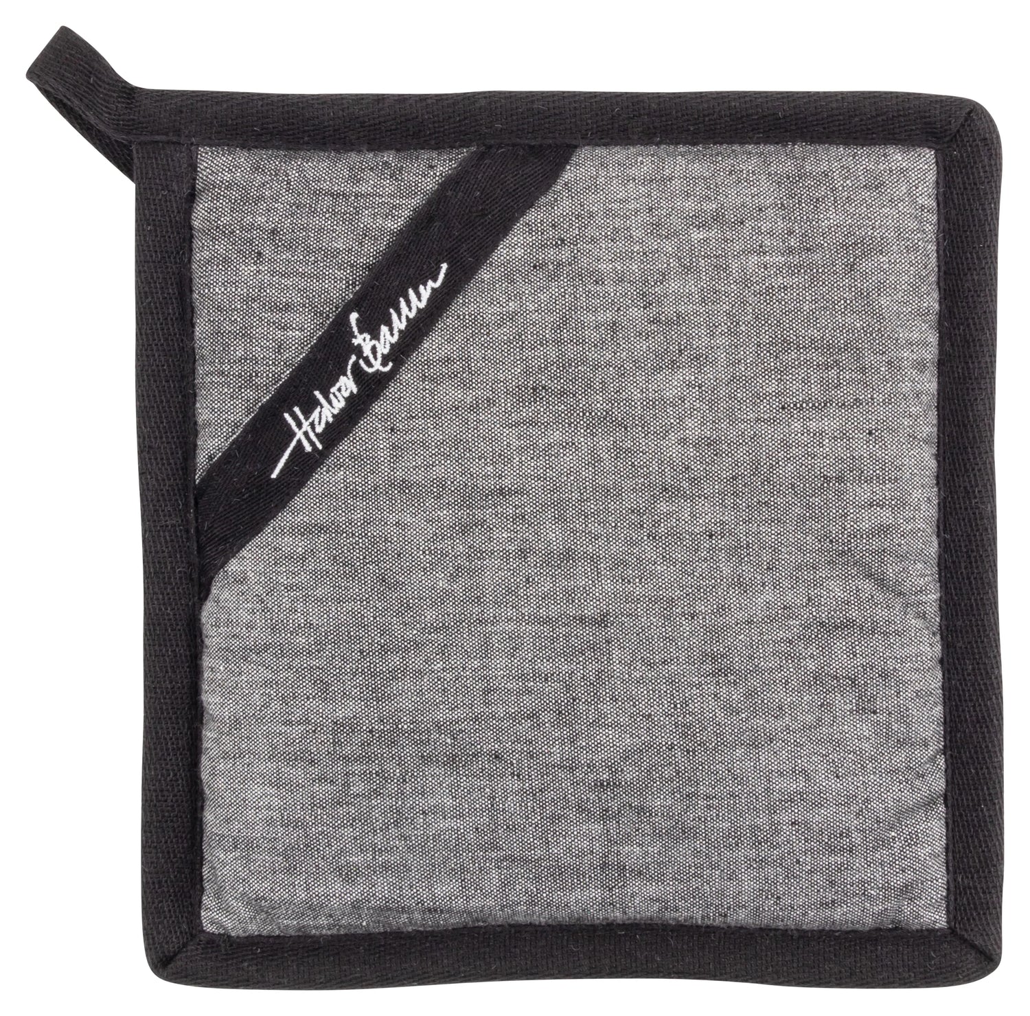 2 grytekluter i 100 prosent bomull, praktisk åpning til hånden og hempe til oppheng gjør dette til et funksjonelt og dekorativt valg i hverdagen. Den mørke fargen gjør dem enkle å kombinere med treverk, stål, stein og andre kjøkkendetaljer, samtidig som uttrykket oppleves ryddig og moderne.