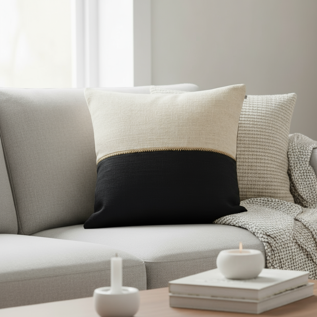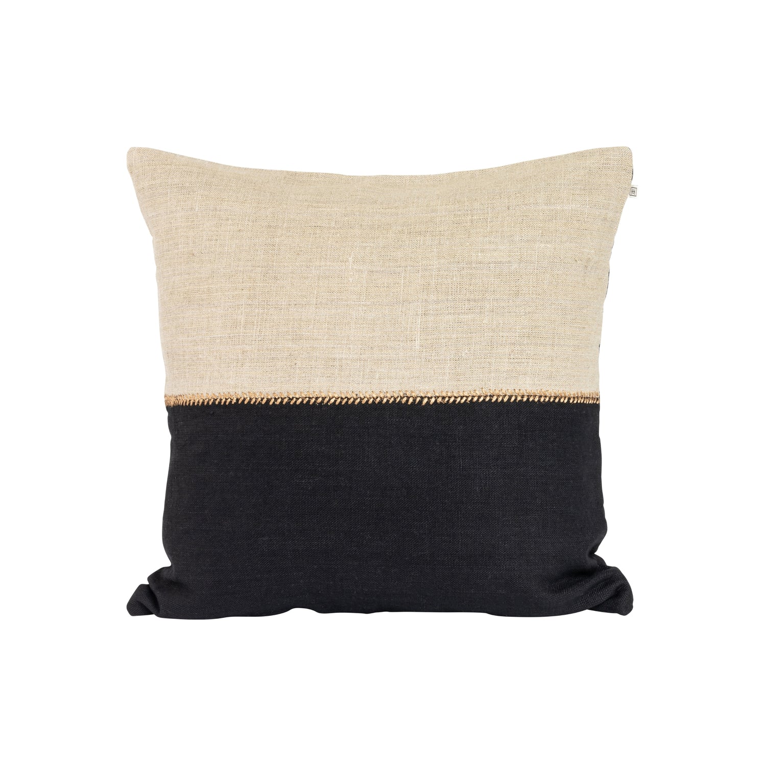 Queenstown putetrekk kombinerer myke naturtoner med moderne kontraster. Den sorte og beige halvdel skilles av en brodert søm som gir puten et håndverksmessig uttrykk.