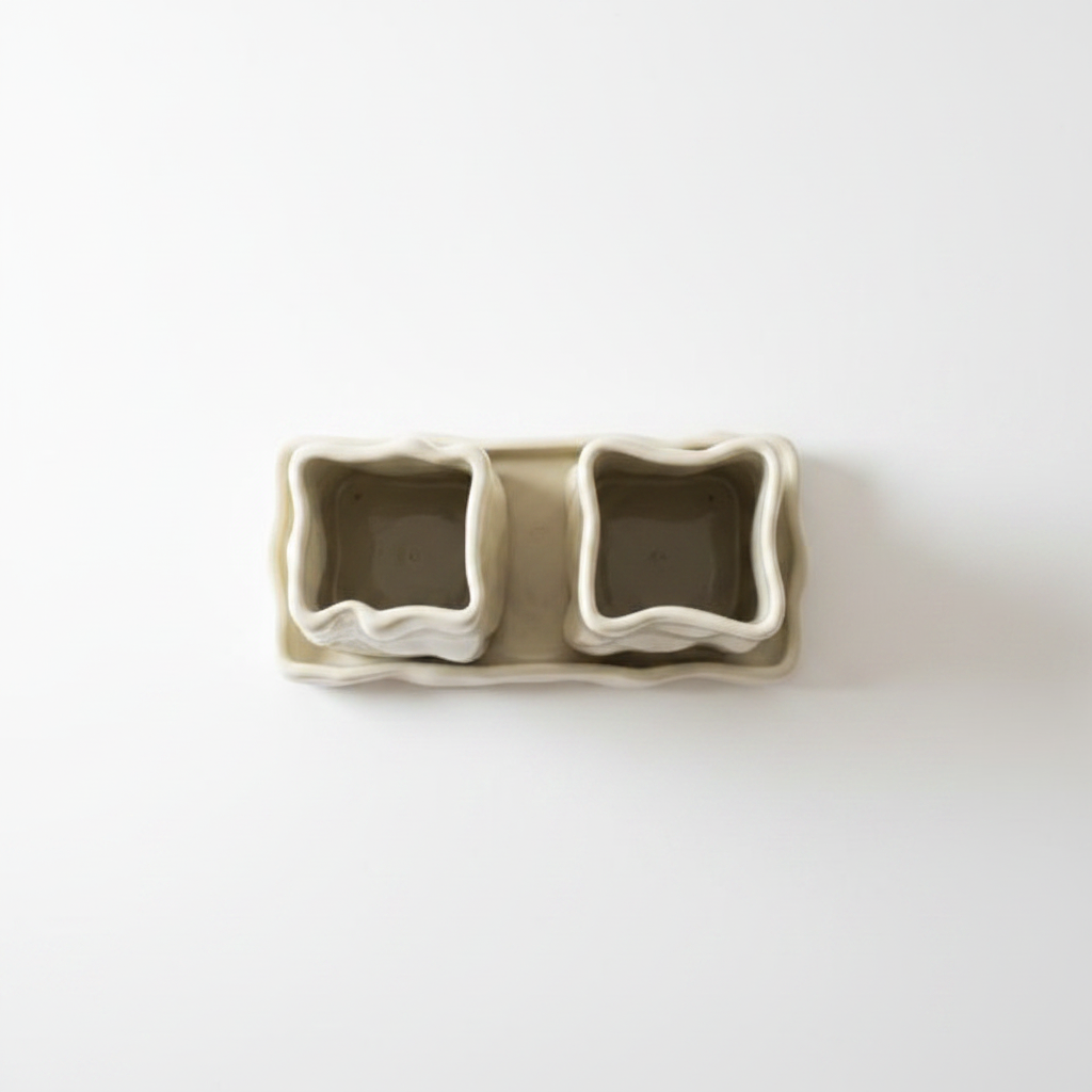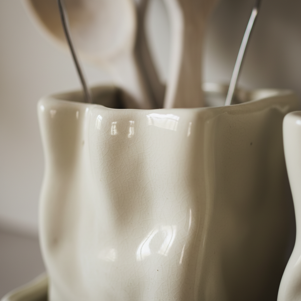 Med 2 keramikkpotter, diameter 8,5 cm og høyde 10 cm får du et dekorativt sett som passer godt til basilikum, timian, rosmarin, mynte og små stiklinger. Den blanke cremefargen og den organisk ujevne formen gir et levende uttrykk som gjør settet like fint alene som sammen med grønne urter.