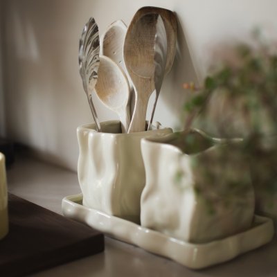 Gi kjøkkenbenken, spisebordet eller vinduskarmen et mykere uttrykk med Herb Shiny Creme urtepottesett i glasert keramikk. Settet består av to små potter og et matchende fat, perfekt til friske urter, små planter eller praktisk oppbevaring av kjøkkenredskaper.