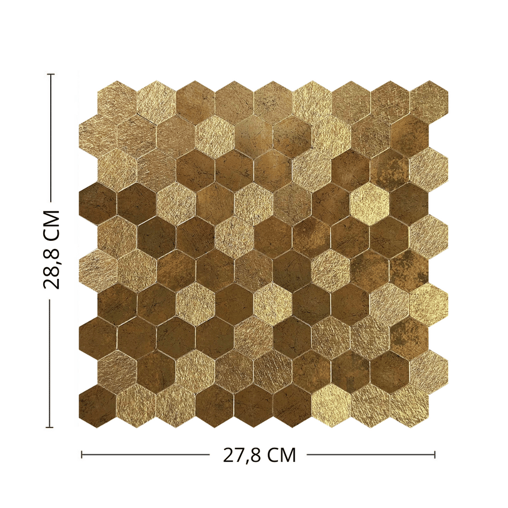 Hexagon Gold selvklebende veggfliser er perfekte for deg som ønsker et glamorøst preg i hjemmet. De gyldne flisene med hexagonmønster gir en luksuriøs stil. Enten du bruker dem som backsplash på kjøkkenet, bak en bar eller som en stilfull detalj på baderommet.