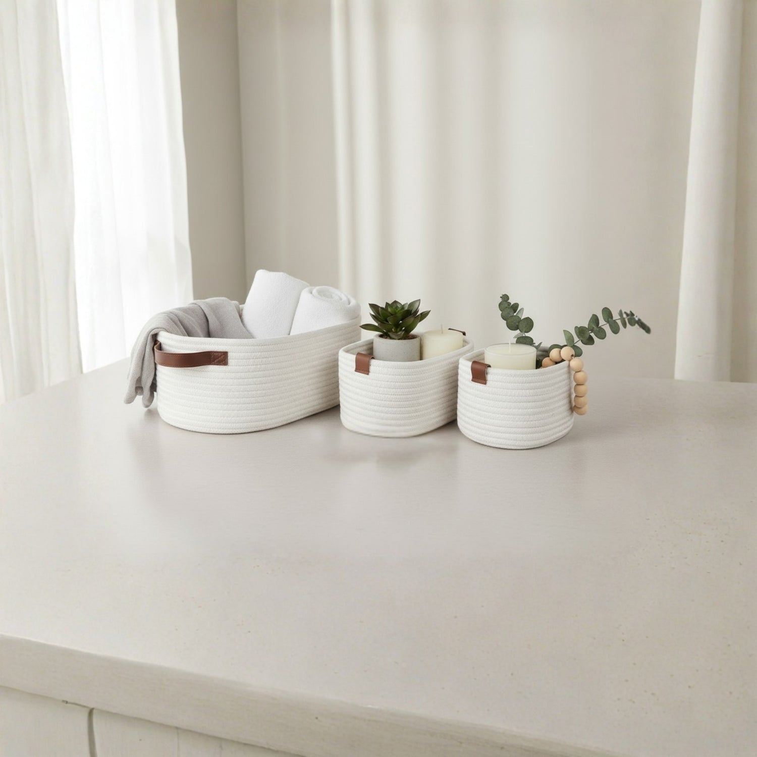Jarana oppbevaringskurver i hvit bomull med kunstlærhåndtak, sett med 3 størrelser