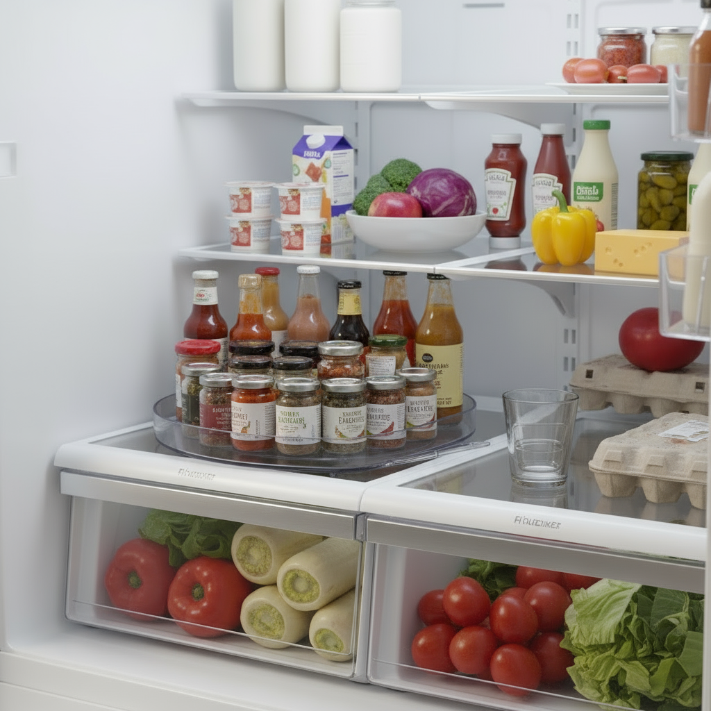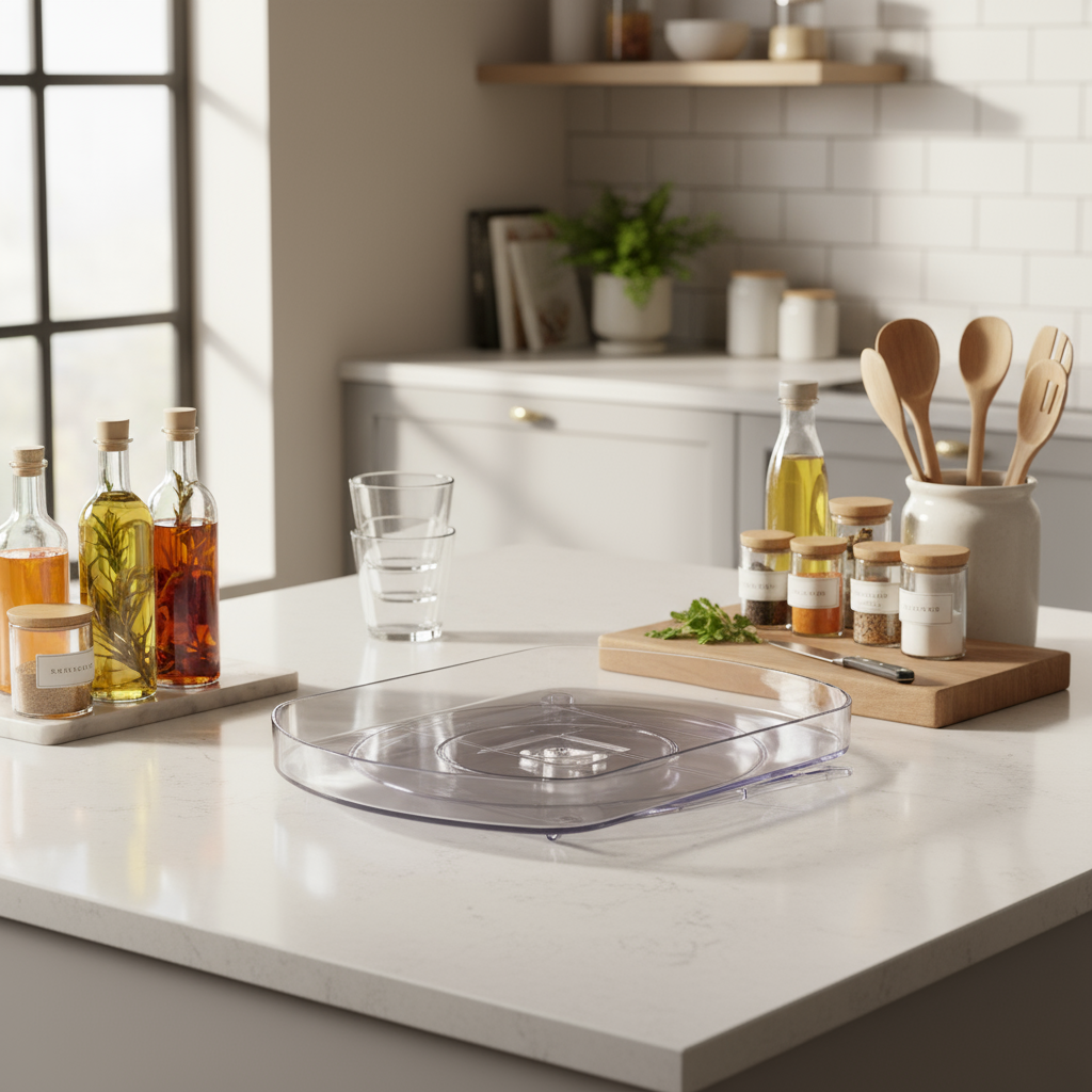 Ovalt snurrebrett i transparent plast med krydder og flasker på kjøkkenbenk