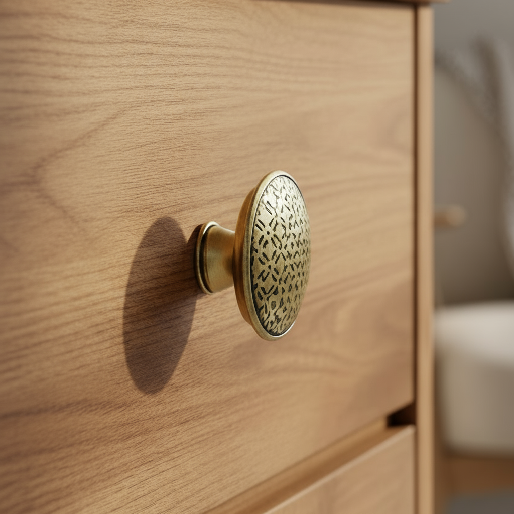 Knotten er laget av metall og leveres med skrue, slik at den er enkel å montere. Det klassiske designet passer like godt i moderne som i tradisjonelle rom og gir møbelet et unikt preg.